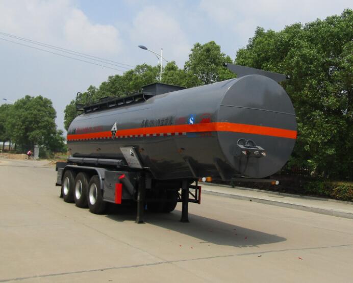 腐蝕性物品半掛運輸車采用的是3橋廣東富華盤式制動車軸,富華氣囊懸架,12條12R22.5 12PR成山牌真空胎(鐵鋼圈)。50牽引銷,28噸單動支腿,EBS,斷氣剎,制動襯片報警,一個備胎架不含備胎。外罐體材質為Q235B型4.2mm厚板材,封頭4.5mm厚,罐體通倉,內襯20mm聚乙烯,雙層鋼襯塑防浪板,兩個全塑罐口蓋,兩套不銹鋼安全閥,帶全塑接酸盤并用軟管引下,罐口周圍用方盒子式圍邊,圍板內做重瀝青防腐,罐體頂部帶不銹鋼升降護欄,花紋板走道,罐體尾底部帶一個DN100不銹鋼襯氟海底閥(海底閥帶聲光報警裝置),罐體后尾部左右各一個DN80襯氟球閥為出料口帶全塑保護箱,大梁下出料,一個工具箱,尾部爬梯。兩根卸料管,兩個8KG滅火器,其余標配。