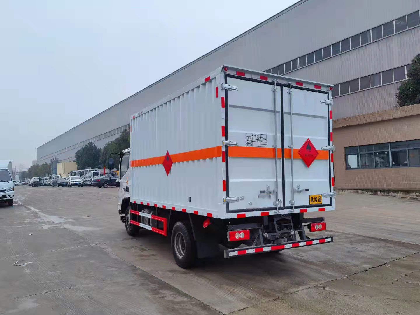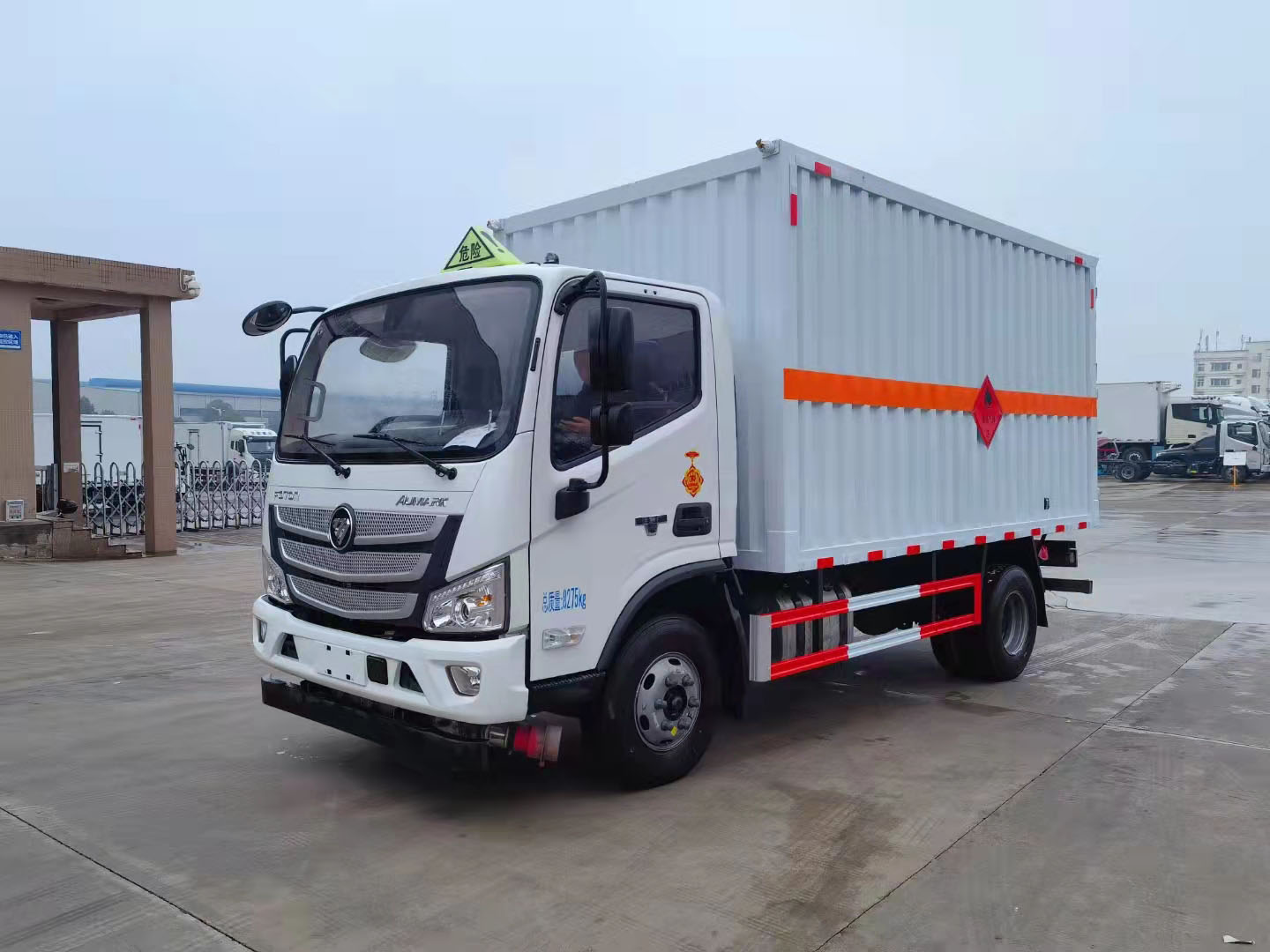 福田歐馬可黃牌4米2帶雙側(cè)門危險(xiǎn)品車整車型號(hào):CSC5088XRQBK6,貨廂4.08米,核載4.3噸,發(fā)動(dòng)機(jī)可選康機(jī)3.8排量156馬力或康機(jī)2.8排量156馬力。 福田歐馬可黃牌危險(xiǎn)品廂式車采用福田歐馬可專用危險(xiǎn)品車底盤,3800mm軸距,福田歐馬可寬體駕駛室,康明斯156馬力發(fā)動(dòng)機(jī),6檔變速箱,6.5噸后橋,9R22.5 14PR輪胎,斷氣剎,中控鎖,電動(dòng)門窗,多功能方向盤,定速巡航,空調(diào),前碰撞預(yù)警,軌道偏移預(yù)警。整車尺寸:7180×2350×3400mm,廂體尺寸:5150×2200×2080mm,廂體嚴(yán)格按照公告尺寸制作,外板采用1mm厚冷軋板有一次性成型的百葉窗,內(nèi)飾為導(dǎo)電性能良好的鋁板有透氣孔,內(nèi)襯為矩形管骨架牢靠穩(wěn)定,內(nèi)部填充為透氣防潮阻燃的擠塑板,四種材料經(jīng)現(xiàn)代工藝復(fù)合而成,廂體外部上下鋁合金型材包邊,底板和車廂前下部鋪橡膠皮,后門雙開,右側(cè)前部單開門,內(nèi)部有固定貨物的臥環(huán),車輛外部有靜電帶、滅火器、防火罩,車廂內(nèi)安裝煙霧提示器和門防盜提示器,嚴(yán)格按照國家危險(xiǎn)品相關(guān)法規(guī)張貼。