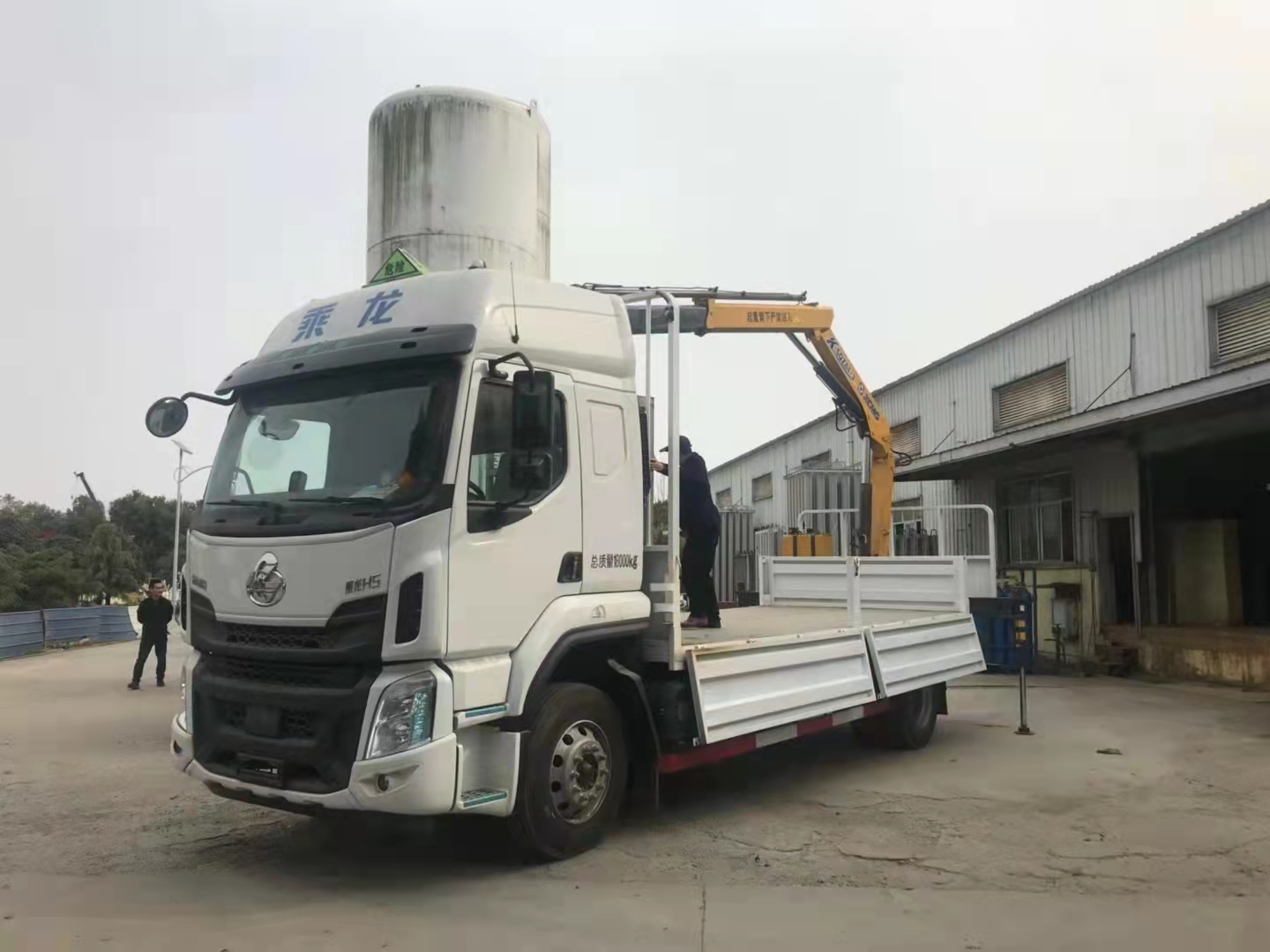 柳汽帶吊氣瓶車整車尺寸:9000×2550×2980mm,廂體尺寸:5600×2420×600mm。嚴格按照公告尺寸制作,底板采用5MM花紋板制作,底板上鋪靜電膠皮,低欄瓦楞式,配備滅火器,三角頂燈,靜電拖帶等,嚴格按照國家危險品法規進行“易燃氣體”標識粘貼等,帶徐工吊(4噸3節折臂)。