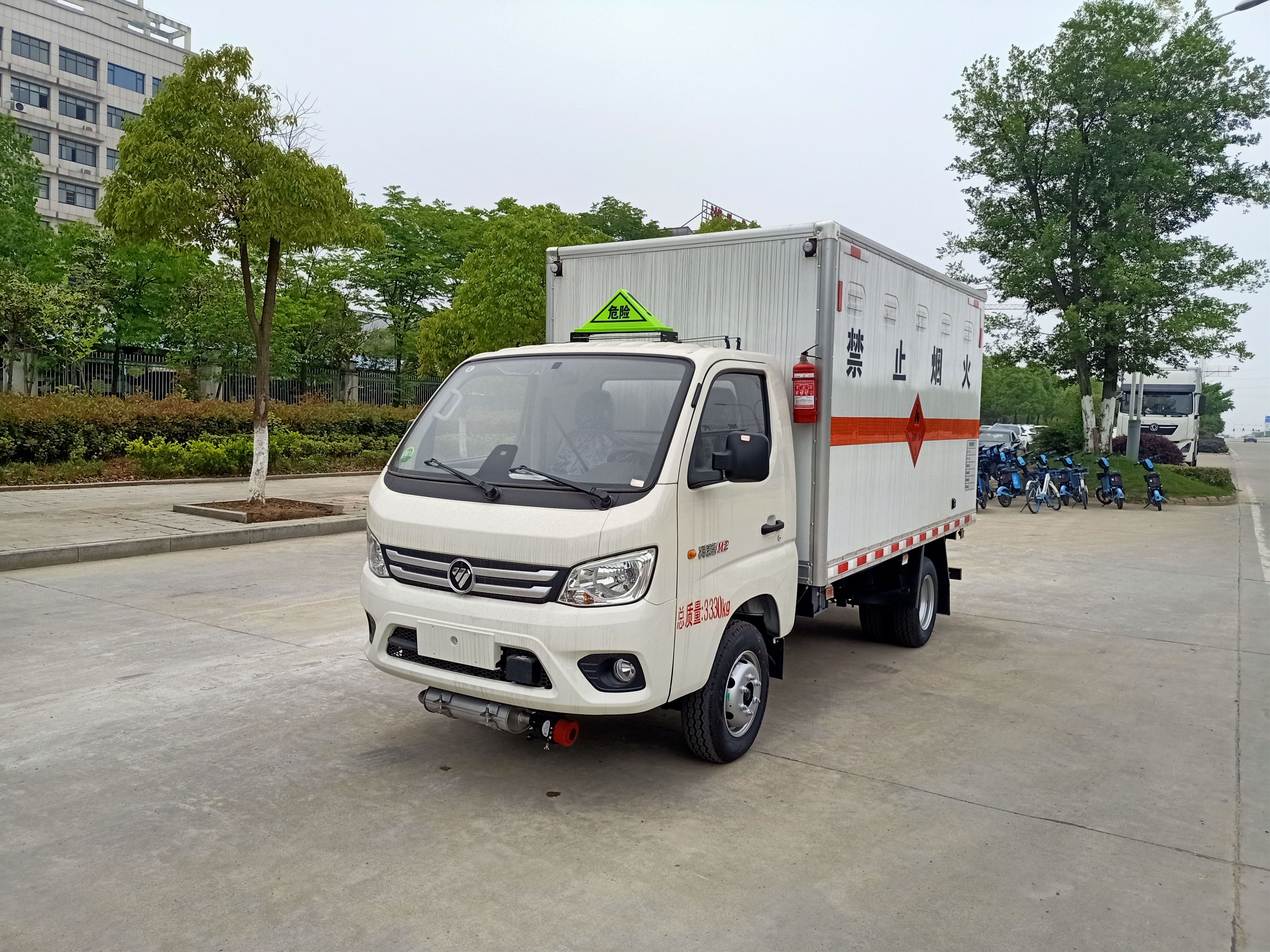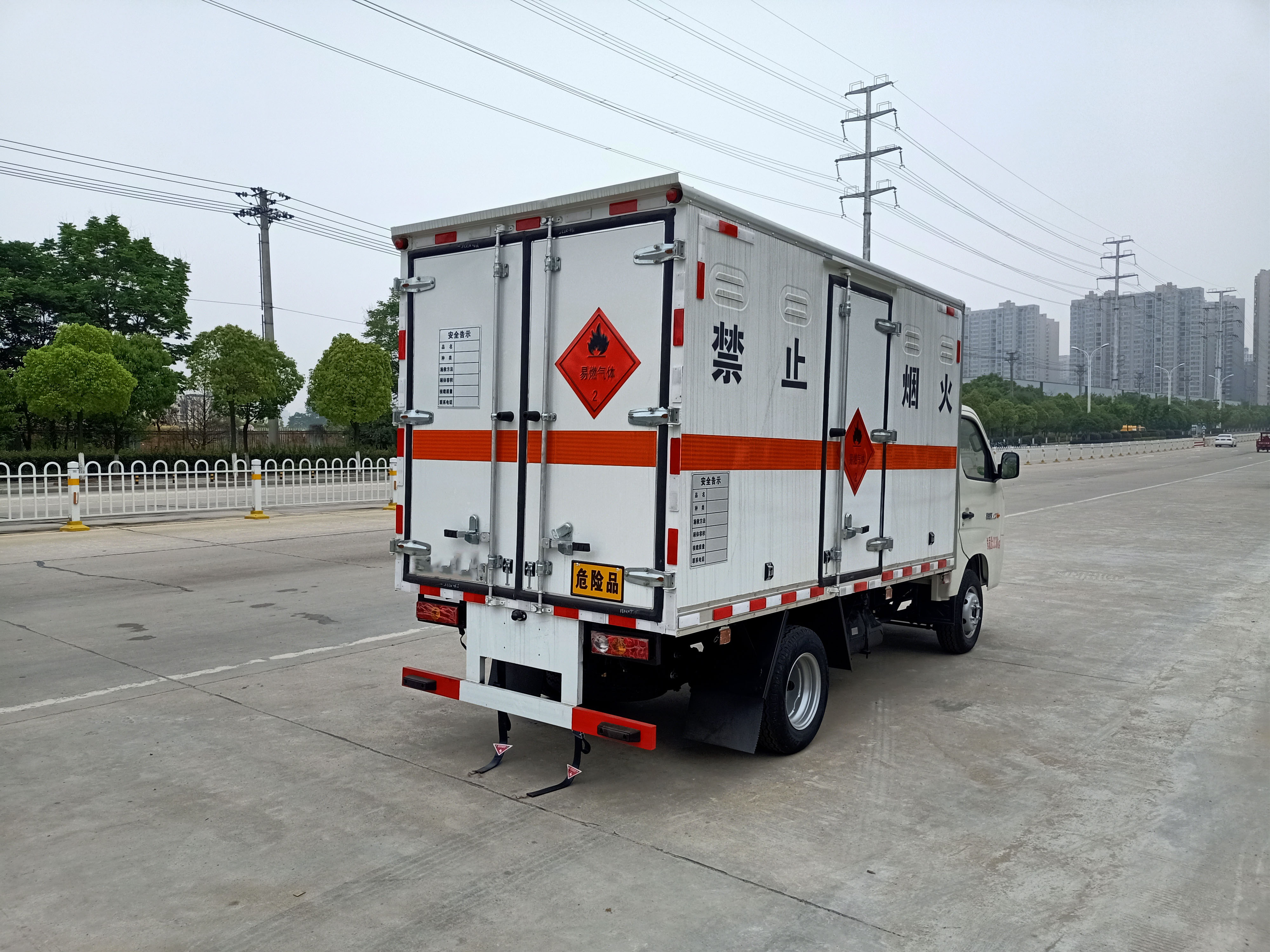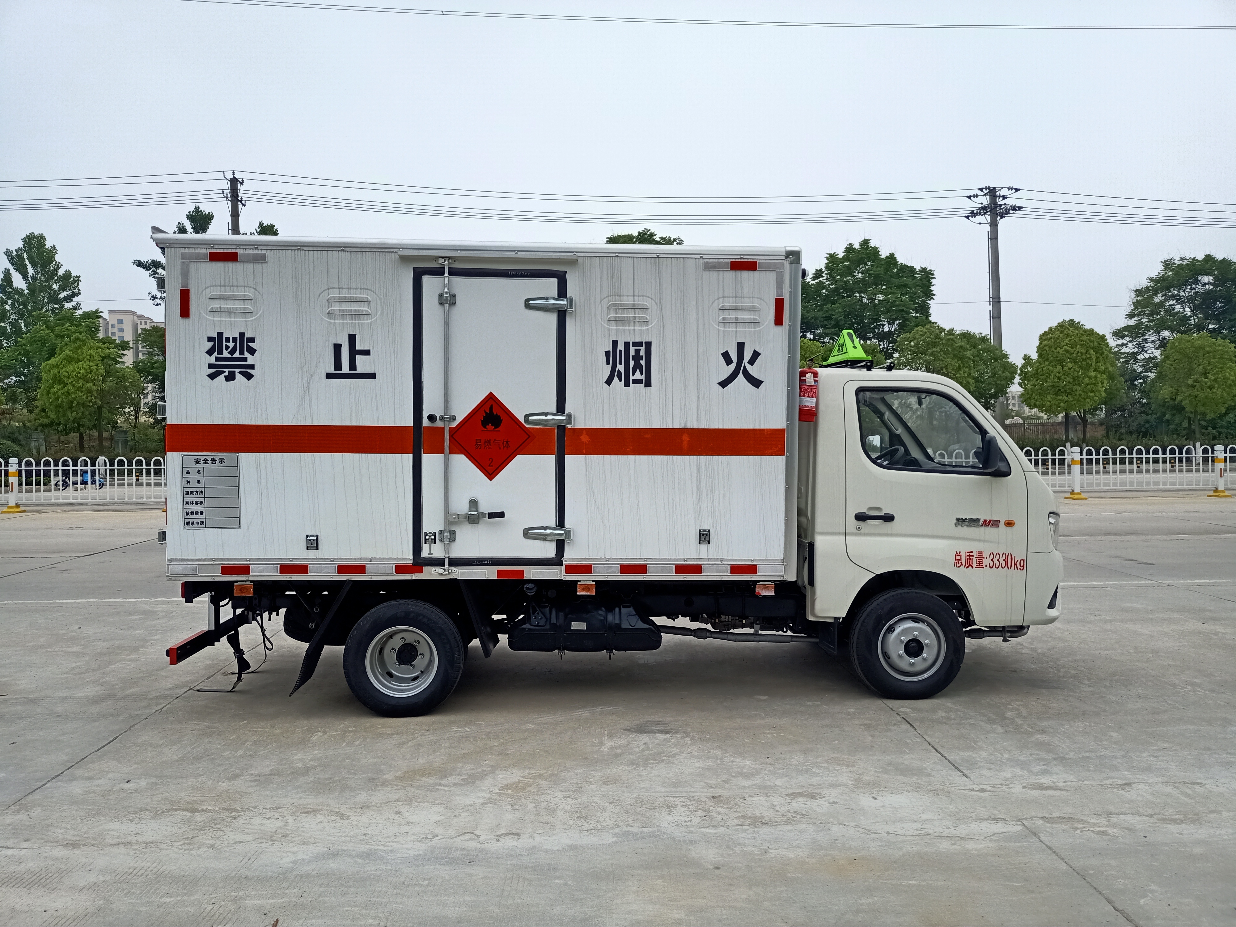 福田時代祥菱M2國六危險品車廂體為雙層金屬骨架結構,外冷軋鋼板內飾鋁板,內壁采用鋁合金板蒙面,夾層為隔熱阻燃材料填充,廂體內部做透氣網,中開側門,廂體內部做防靜電處理,廂體底部鋪導靜電膠板,車輛副梁配備導靜電帶,廂體內襯壁裝單排臥環,廂體內頂部安裝煙感報警器,廂體安裝防盜報警器。隨車配備手提滅火器,危險品三角頂燈,防護帽等,嚴格按照國家危險品法規進行標識粘貼等,其余廠家標配。