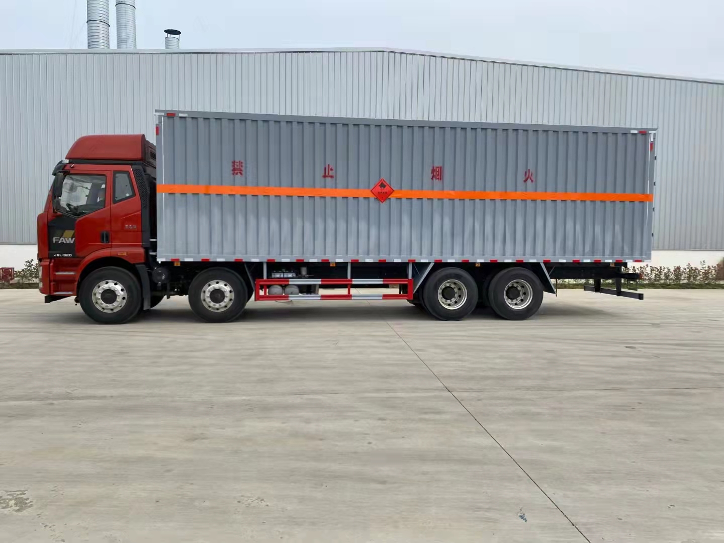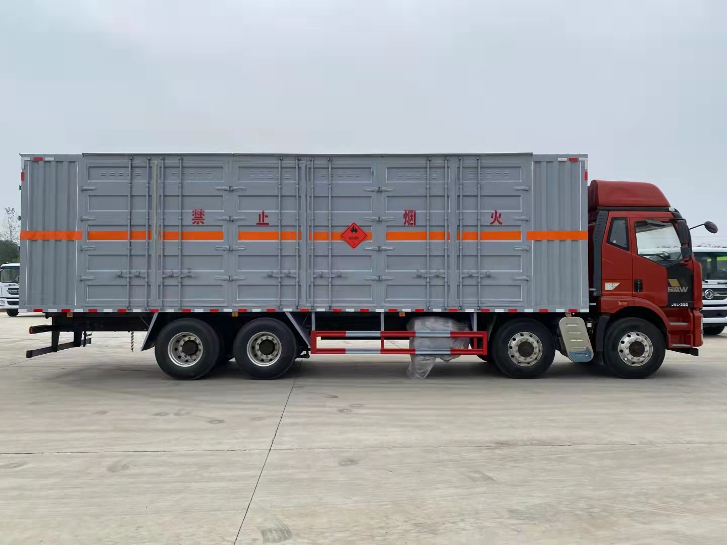 解放前四后八國六瓦楞板危險品車采用的是新J6L全浮高頂排半駕駛室、液晶儀表、電動玻璃升降、電動后視鏡、側圍網兜、后圍窗簾導軌、全景窗簾導軌、駕駛員座椅為空氣減振座椅、單DIN北斗兼容車載系統、電源總開關控制開關,大柴CA6DK1-32E61(EGR+DOC+DPF+SCR、雙腔空壓機、發動機制動),變速箱CA10TA130M變速器(全鋁殼體),車橋ф435沖焊橋(進口ABS、1878輪距、2孔V桿),速比3.727,12R22.5型18層級輪胎(輕量化輪輞、雙錢花紋RR100/朝陽花紋AS578/正新花紋CR260),270×75×(7+5),自動空調、前下防護裝置、駕駛室四點螺簧懸置、一體式寬體保險杠、電動液壓舉升裝置、后懸2500mm、車輛限速、排氣火花熄滅器、整車配備靜電拖地帶1根、駕駛室帶2kg干粉滅火器1個、懸架3/3/-(8氣囊)、排氣尾管及消聲器前置、前盤后楔式制動器、右轉彎音響提示、爆胎應急安全裝置、安全帶佩戴提醒、制動襯片更換報警、鋁油箱300L、T-box1.5、U型后處理、EBS+ESC、單胎帶TPMS(胎壓監測)、鋁貯氣筒、LDW+FCW、天線操縱、排氣節流閥、AEBS(自動緊急制動)。軸距1900+4500+1350mm。