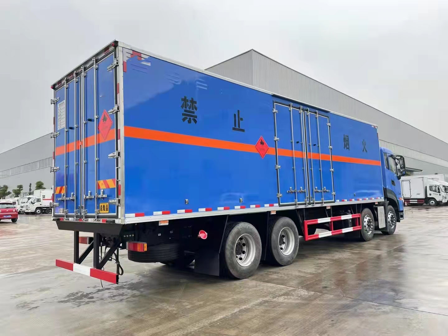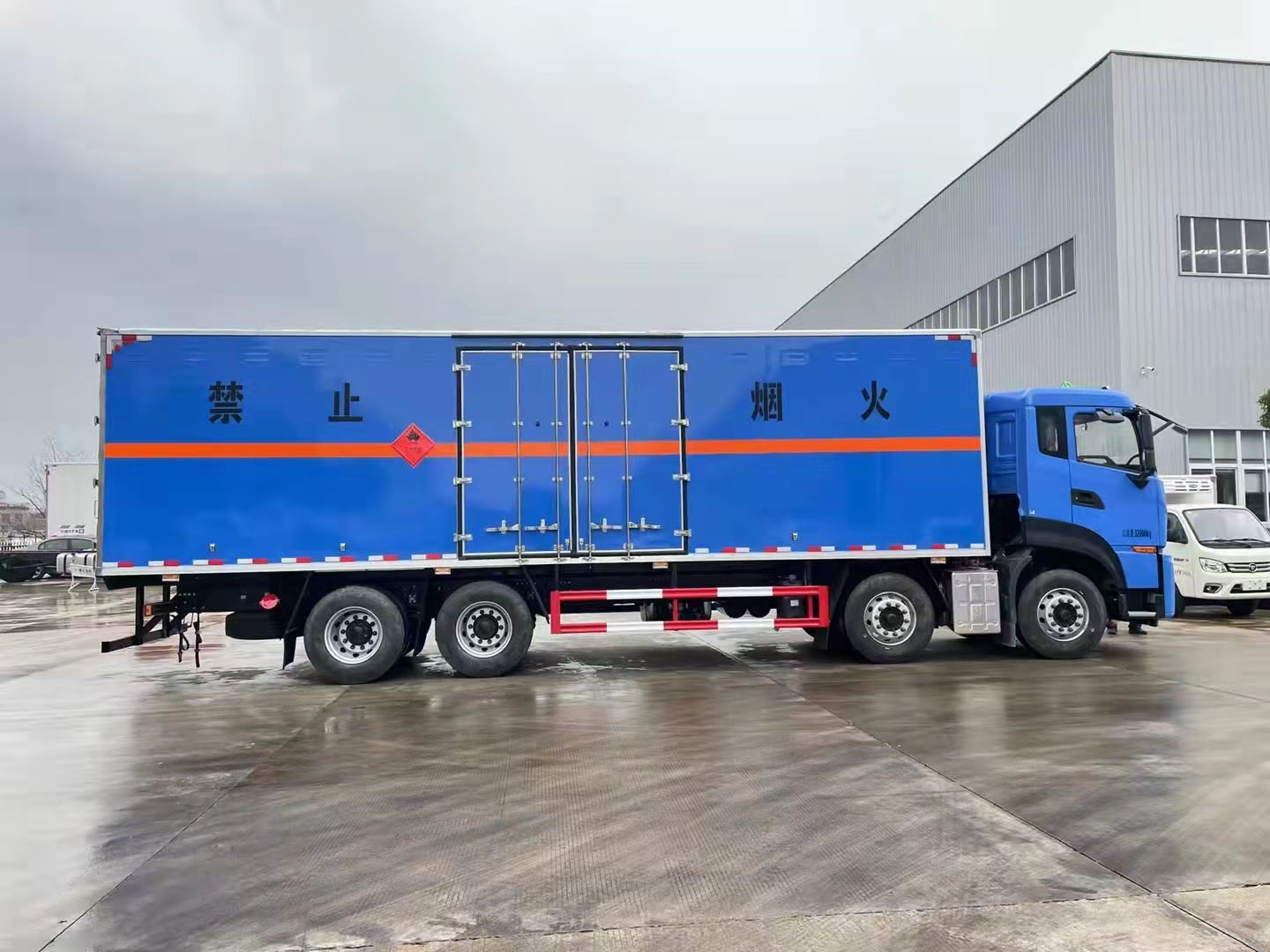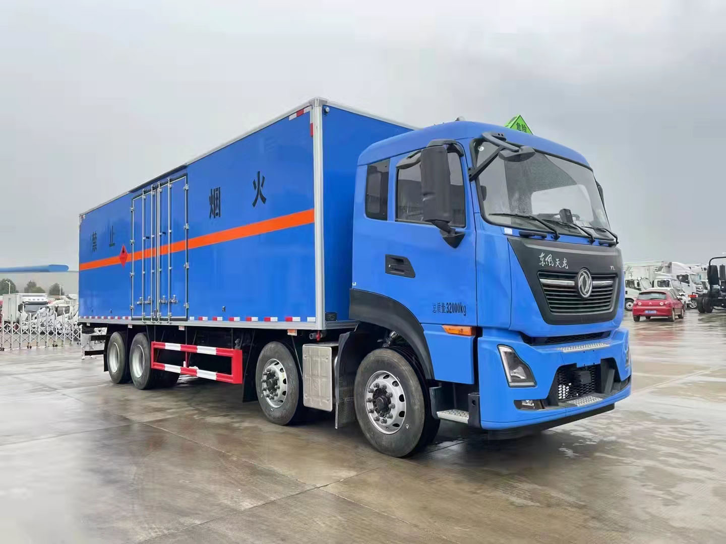 東風天龍KL整車藍色前四后八危險品車箱體帶側門,箱體采用的是復合板箱體,帶防阻燃材料,裝載容積大,該車定制的顏色可多選,定制您專用的顏色,讓您的車輛顏色更炫目。