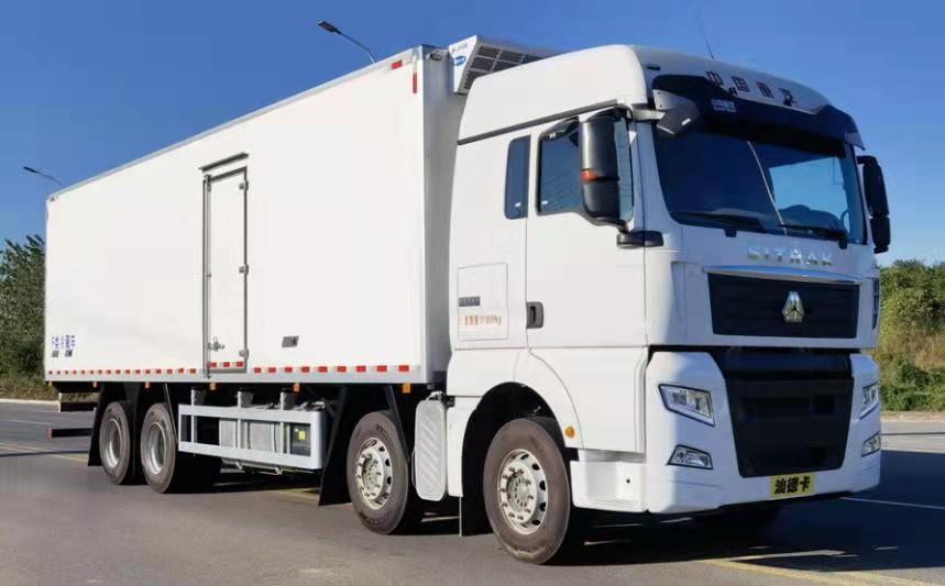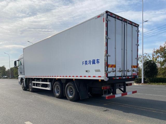 汕德卡4橋氣囊G7國六440馬力冷藏車 貨箱尺寸:9400*2430*2450mm,外形尺寸:12000*2600*4000mm,總質量:31000kg。采用的汕德卡 G7駕駛室,氣囊通風加熱座椅,多功能方向盤,后視鏡加熱及電動,四點氣囊懸浮 ;MC11.44-60發動機;HW25712XSTCL變速箱;VPD75ES前軸(盤);MCY11BGS自調臂雙后橋(鼓);速比3.7;單層車架(8/300);前后少片簧(3/3/4);博世方向機;標準版排氣系統;普通寒區包;ABS(4S/4M);低位保險杠(非金屬);295/80R22.5;600L油箱;電磁式電源開關;終端排放監控裝置;選裝倒車蜂鳴器;選裝胎壓監測系統; 軸距:1950+4600+1400mm。馬力大,扭矩強,支持自動換擋,實現全工況冷鏈運輸高效運營。通過動力鏈高效節油黑科技,以及整車輕量化設計搭載低風阻駕駛室,多重技術節油。