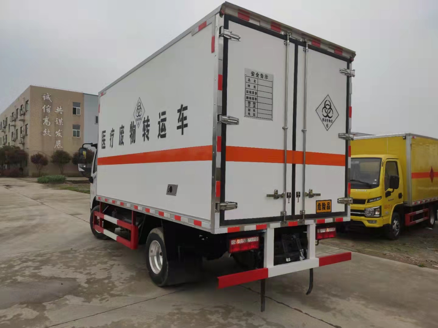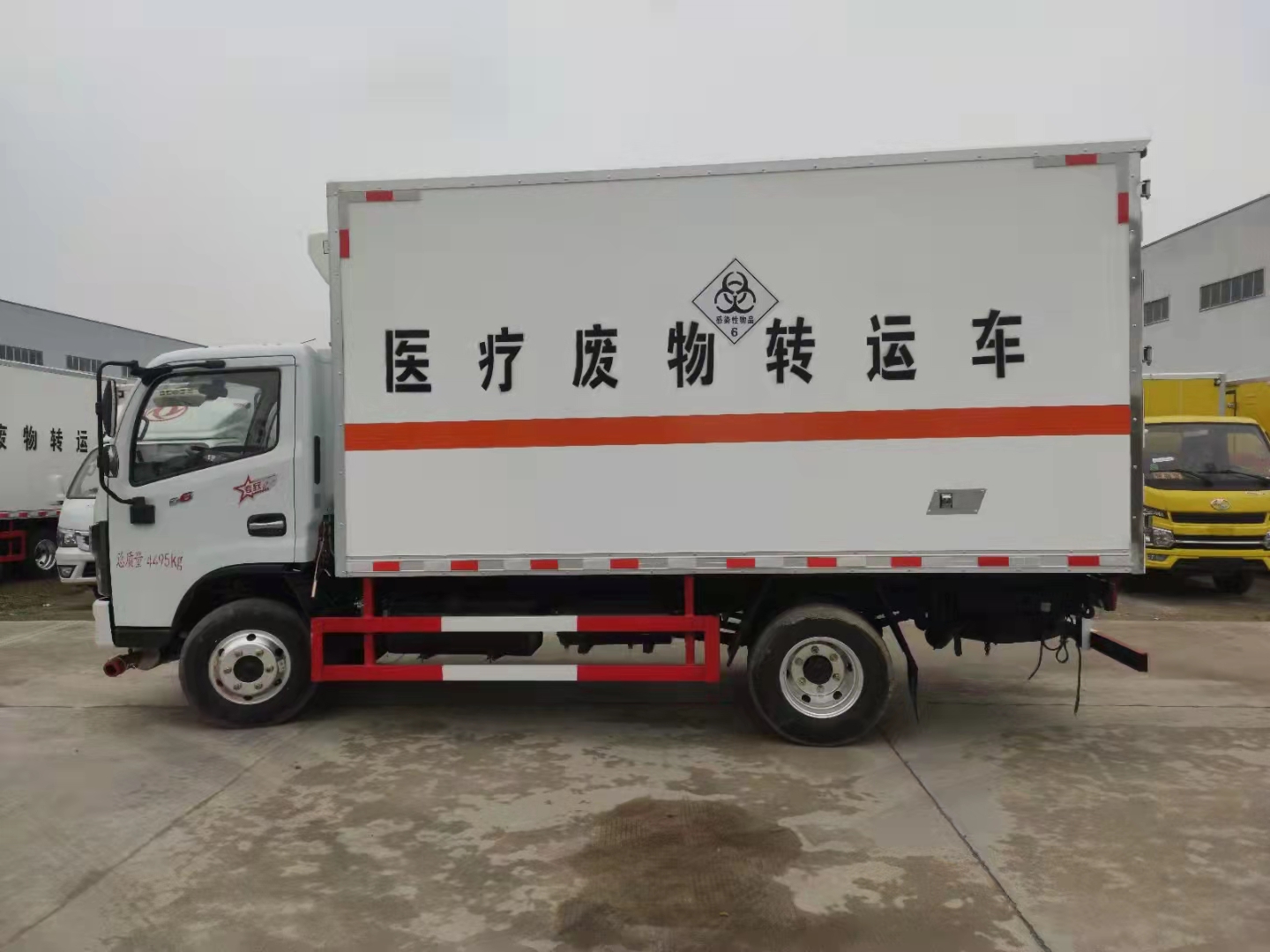 東風多利卡藍牌醫廢車采用東風原廠危化底盤。國六危化功率,115馬力,輪胎7.00R16,動轉,離合助力,斷氣剎,空調電窗中控鎖,ABS,排氣管前置,電源開關,ECU限速,帶雙預警。整車尺寸:5995,5600,5300×2100,2040×3020(mm)箱體尺寸:4000,3850×1950,1800×1800(mm)廂體外玻璃鋼內不銹鋼,中間填充高密度保溫材料(聚氨脂),后門為雙層密閉結構,并采用迷宮式封條,使車廂完全封閉。廂內安裝紫外線消毒燈,加裝自動消毒噴霧器。廂體兩側帶固定貨物卡槽。醫療廢物轉運車采用帶有“醫療廢物”標識。整車帶零下5度冷藏機組,品牌:漢雪。