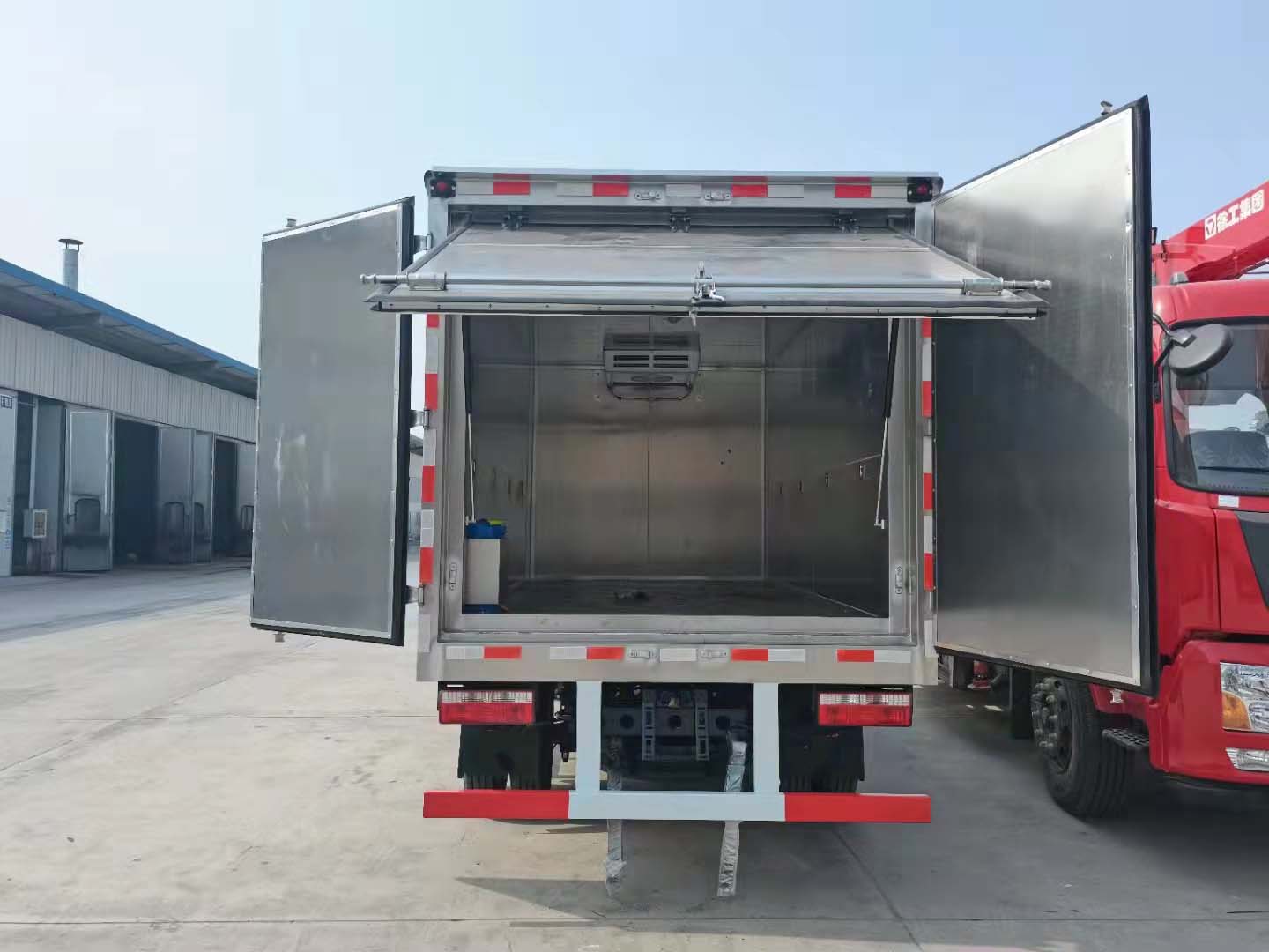 4、廂體外玻璃鋼內不銹鋼,中間填充高密度保溫材料(聚氨脂),后門為雙層密閉結構,并采用迷宮式封條,使車廂完全封閉。廂內安裝紫外線消毒燈,加裝自動消毒噴霧器。廂體兩側帶固定貨物卡槽。醫療廢物轉運車采用帶有“醫療廢物”標識。整車帶零下5度冷藏機組。