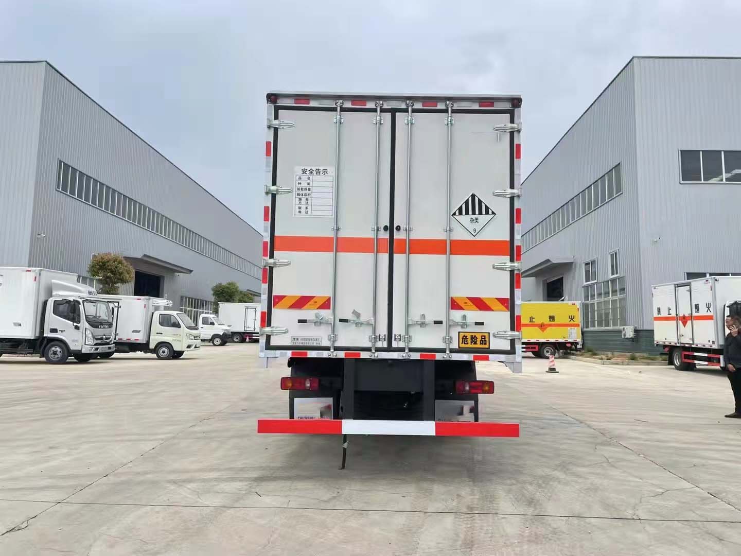 東風天錦雜項國六帶制冷機組危險品車嚴格按照公告尺寸制作。外板采用烤漆板帶百葉窗,內飾為導電性能良好的鋁平板有透氣孔,矩形骨架結構內部填充防火阻燃材料,復合加鉚合工藝。廂體四周鋁合金包邊及包角,車廂底板鋪設防靜電膠皮,廂體前臉50公分高鋪設防靜電膠皮。后部設置對開門,右側單開門,廂體內部兩側安裝捆綁貨物的臥環。廂體內部安裝煙霧,門上安裝防盜。車廂一周粘貼橙色反光帶,箱體粘貼菱形標志牌,安全告示牌,危險品牌,箱體安裝示廓燈(前白后紅),拖地靜電帶。