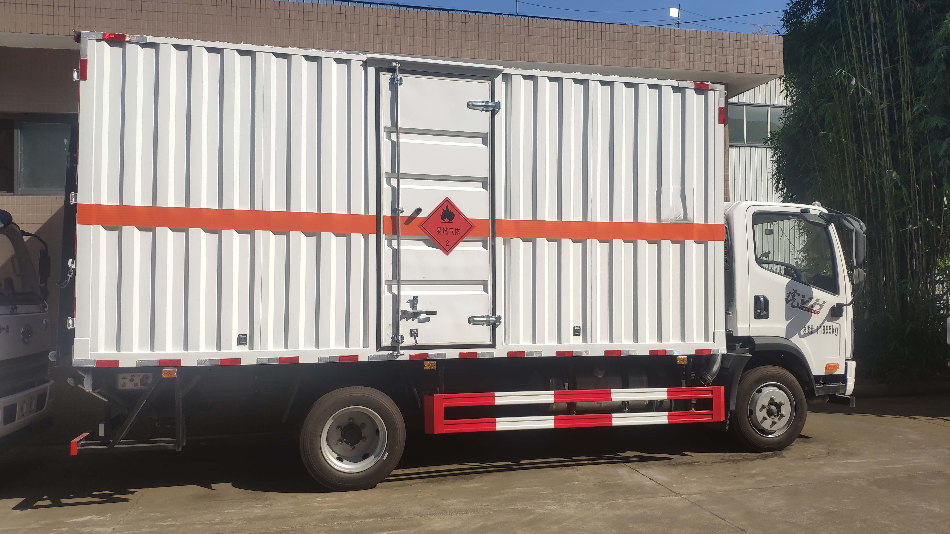 2類:易燃?xì)怏w廂式運(yùn)輸車;類別項(xiàng)號(hào):2.1,2.2;該車用于運(yùn)輸具有獨(dú)立容器(瓶)包裝的易燃?xì)怏w:液化石油氣,原油氣,丁烷,天然氣,乙炔,甲烷,丙烷,丙烯,丁烯、氫氣,硫化氫,打火機(jī)或打火機(jī)加油器,壓縮氫等。同時(shí)適用于運(yùn)輸具有獨(dú)立容器(瓶)包裝的非易燃無毒氣體:二氧化碳,壓縮(空氣、氮?dú)狻⒑狻鍤狻⒛蕷狻⒀鯕狻㈦硽狻⒍趸?,2類滅火器等。