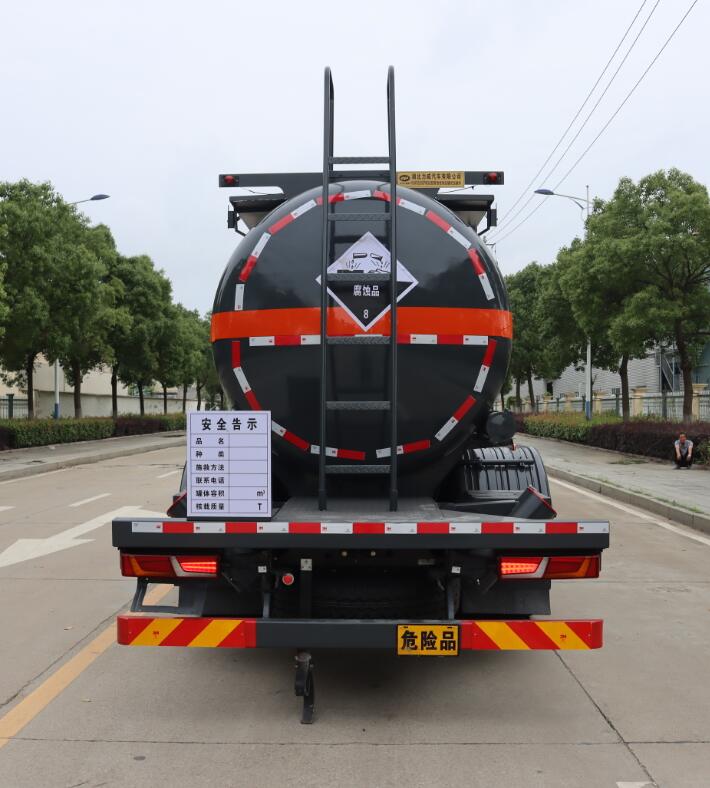 陜汽德龍國六前四后八腐蝕品罐式車罐體及整車尺寸嚴格按公告制作,整車型號:HLW5320GFWS6,罐體總容量:17.5立方。外罐體材料為Q235B型碳鋼板材,筒體4mm,封頭5mm,罐體通倉,蝶形封頭,內襯聚乙稀塑厚度16mm,兩道鋼塑式防浪板,兩個全塑罐口帶接酸盤,一套安全閥,罐體底部帶一套DN100型不銹鋼襯四氟緊急切斷閥(帶聲光報警裝置),副梁前高后低,4寸襯塑管道,尾部大梁下左右邊各一個DN80型襯氟球閥出口為出料口并帶全塑保護箱。罐體頂部帶上圍板,圍板內做防腐處理,帶不銹鋼升降護欄,走道,尾部爬梯,兩根卸料管帶PVC炮筒管,兩個8KG滅火器,一個工具箱,其余按廠家標配生產制作。