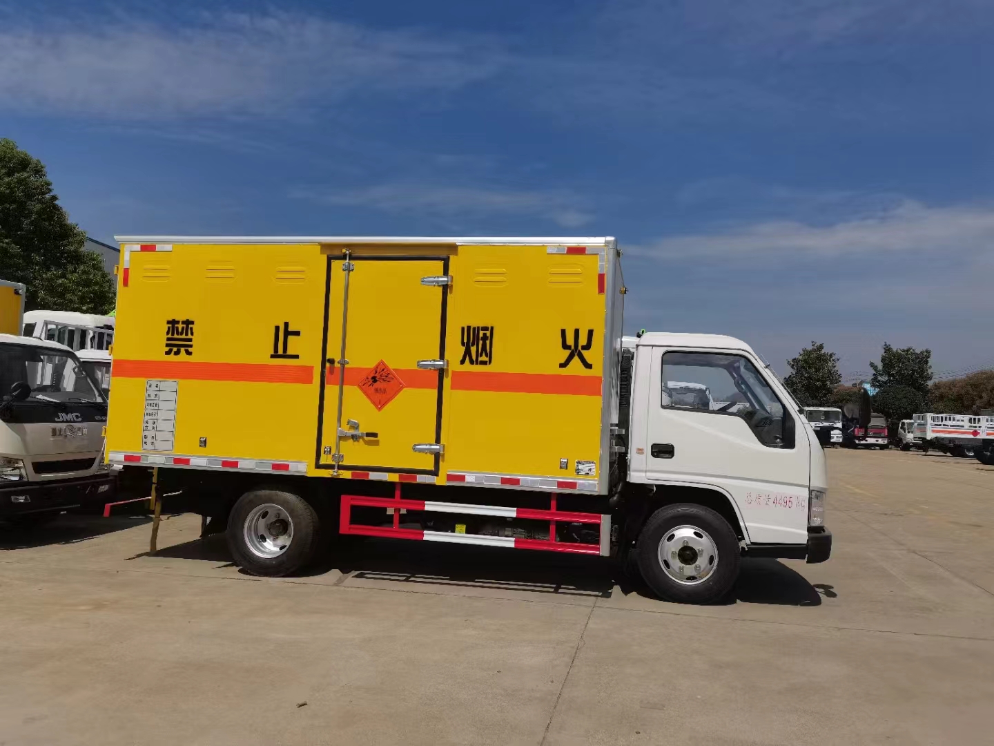 江鈴國六帶前開側門黃色危險品車采用的是江鈴危化品專用底盤,五十鈴122馬力發動機,帶中控鎖、電動門窗、原廠空調,為了讓車輛更耐用,我司生產的車輛全部采用的是烤漆板,箱體全部采用的是防阻燃材料,箱體內部全部采用的是固定臥環。