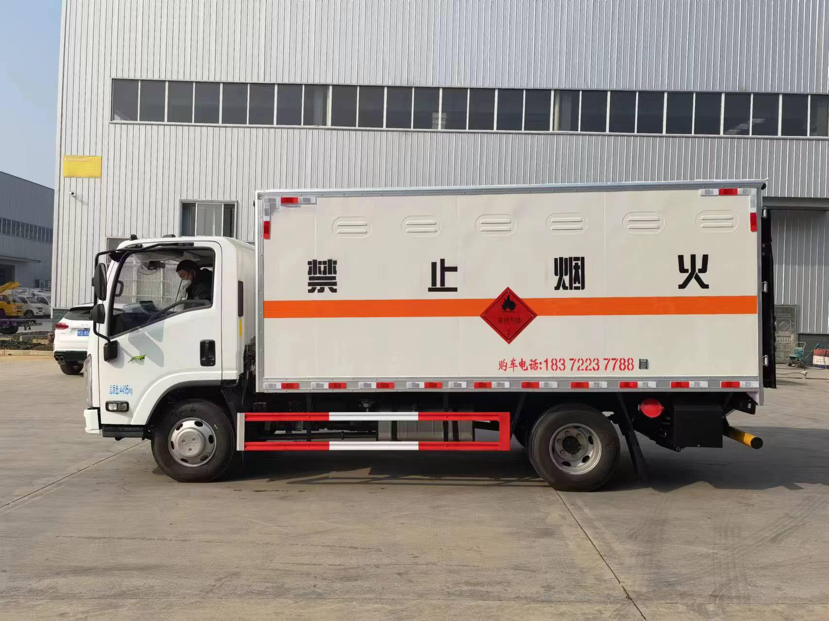 五十鈴國六二類危化車所采用的是危險品專用的輕卡底盤,126馬力發動機(滿足2.5排量新規標準),斷氣剎(應對不同的路況更穩定及長久),帶中控鎖、電動門窗、原廠空調,時尚前臉讓車輛造型更美觀,采用的是烤漆板箱體設計,為了方便裝貨,箱體側面采用的是一個雙開門形式。尾部帶液壓尾板整車不超重,重點是裝卸貨物更方便。