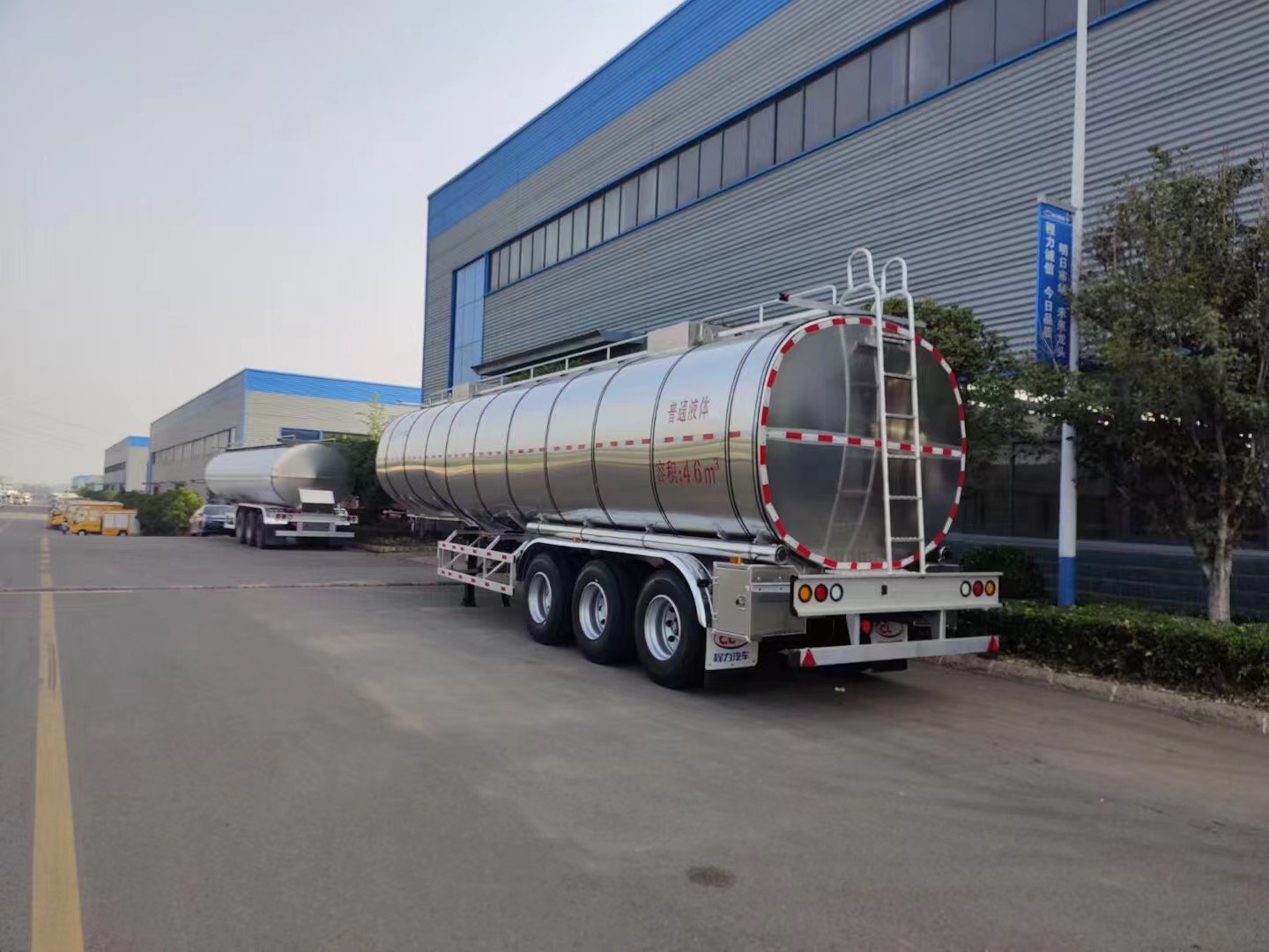 46方鋁合金普通液體運輸半掛車上裝內罐容積:46方,采用5182鋁合金材質制作,罐體5mm,隔板:5mm,封頭6mm,外保溫層厚度50mm,外包鏡面不銹鋼,帶六爪快開罐口(或者歐標罐口),帶后尾部左右自流,選裝海底閥,選裝加熱管,底架配置:3軸13噸廣東富華橋,兩軸帶ABS,12條12.00R22.5真空胎配普通鋼圈,16噸剎車片,50牽引銷,28噸單動支腿,其他按廠標配。
