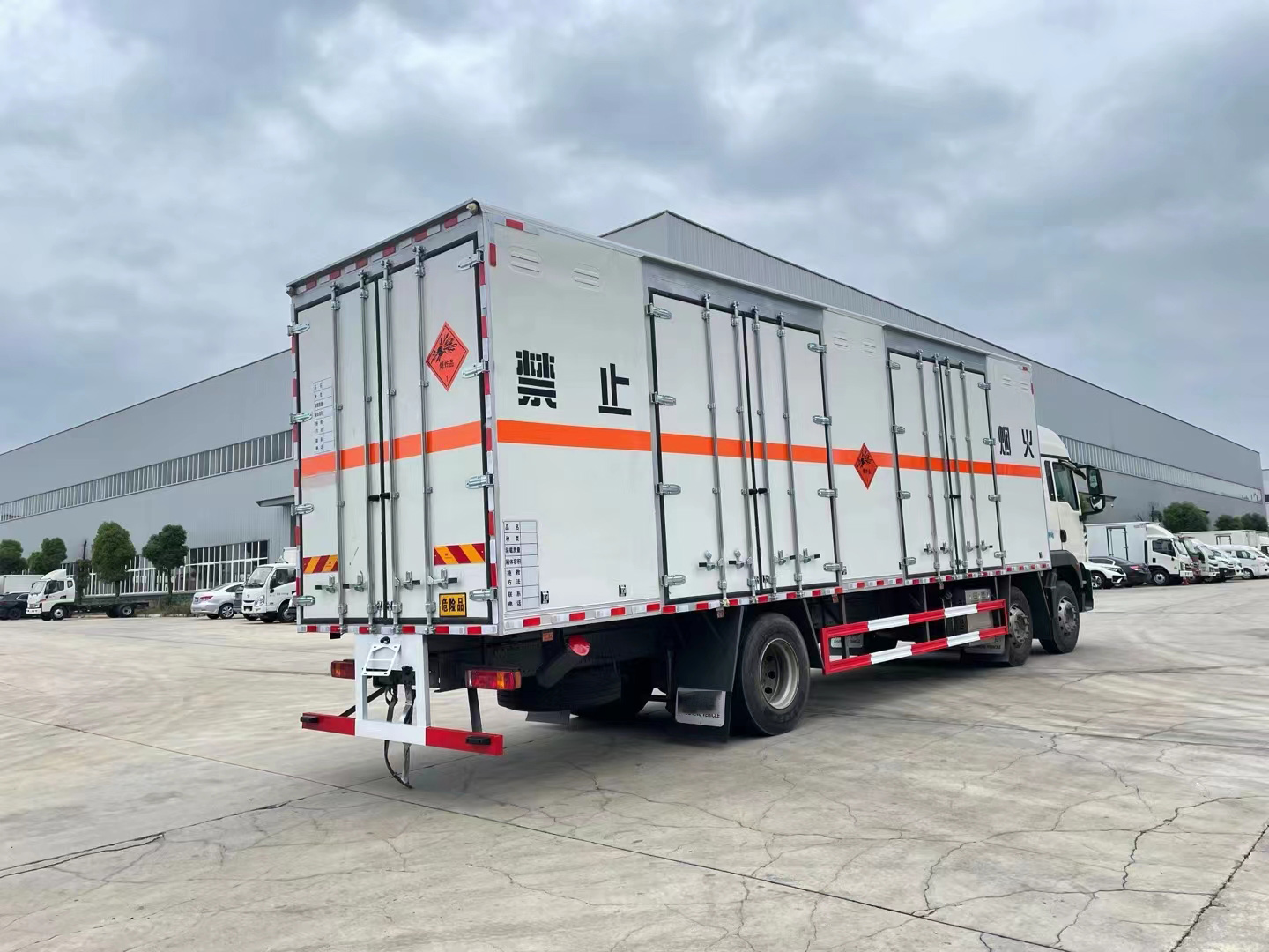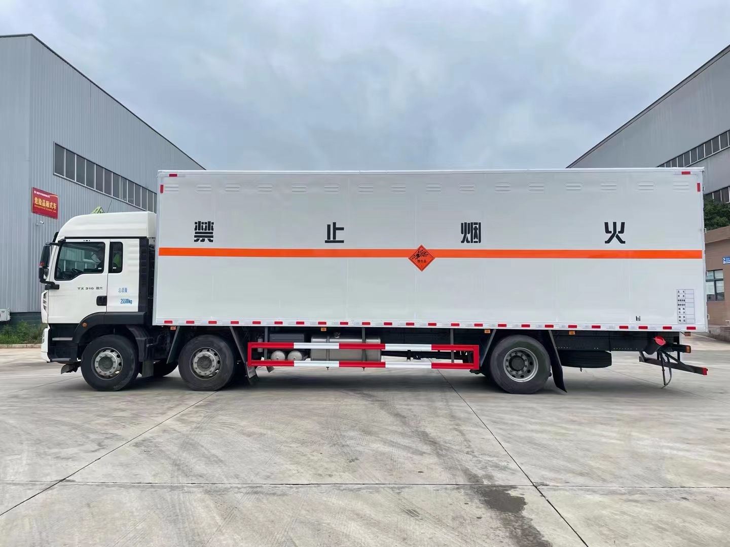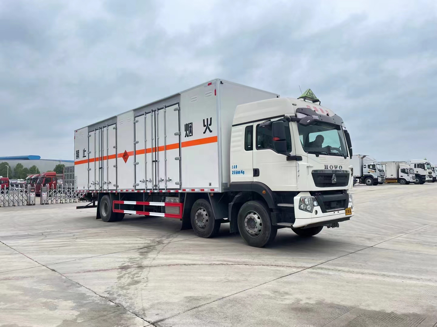 重汽豪沃9.6米三軸煙花爆竹運輸車采用的是豪沃專用;返妆P,可選濰柴310馬力或濰柴250馬力,可帶高頂雙臥駕駛室,駕乘人數為3人,除了裝載駕駛員、爆破員還可以承載押運員。箱體內部容積63.5方,德國曼310馬力發動機,9檔變速箱,295真空胎,速比4.63,400L油箱。采用的是HW95508STC變速箱;VPD75D前軸(盤);MCY11BES單后橋(盤);速比4.63;雙層車架(8+4/280);前少后空氣懸架(3/3/-);國產方向機;前置排氣系統;EBS+ESC;中位保險杠(非金屬);鋁合金車輪(國產);295/80R22.5;300L油箱;LDWS+FCWS(帶雷達);旋鈕式PTO;中國重汽智能通D版;電磁式電源開關;轉向輪爆胎應急裝置;選裝胎壓監測系統;(ZZ1267N56CGF1K/MC07.25-60)。