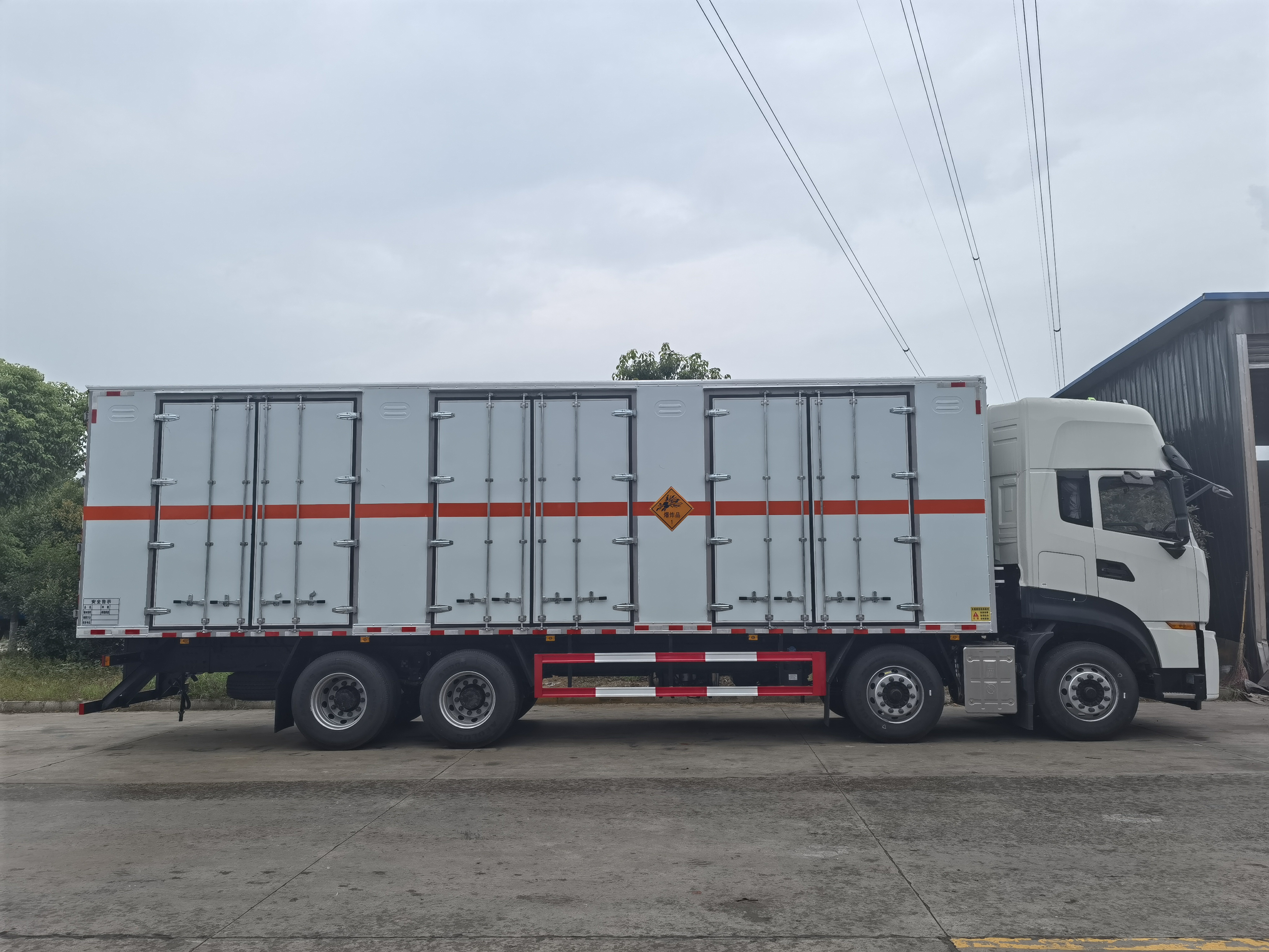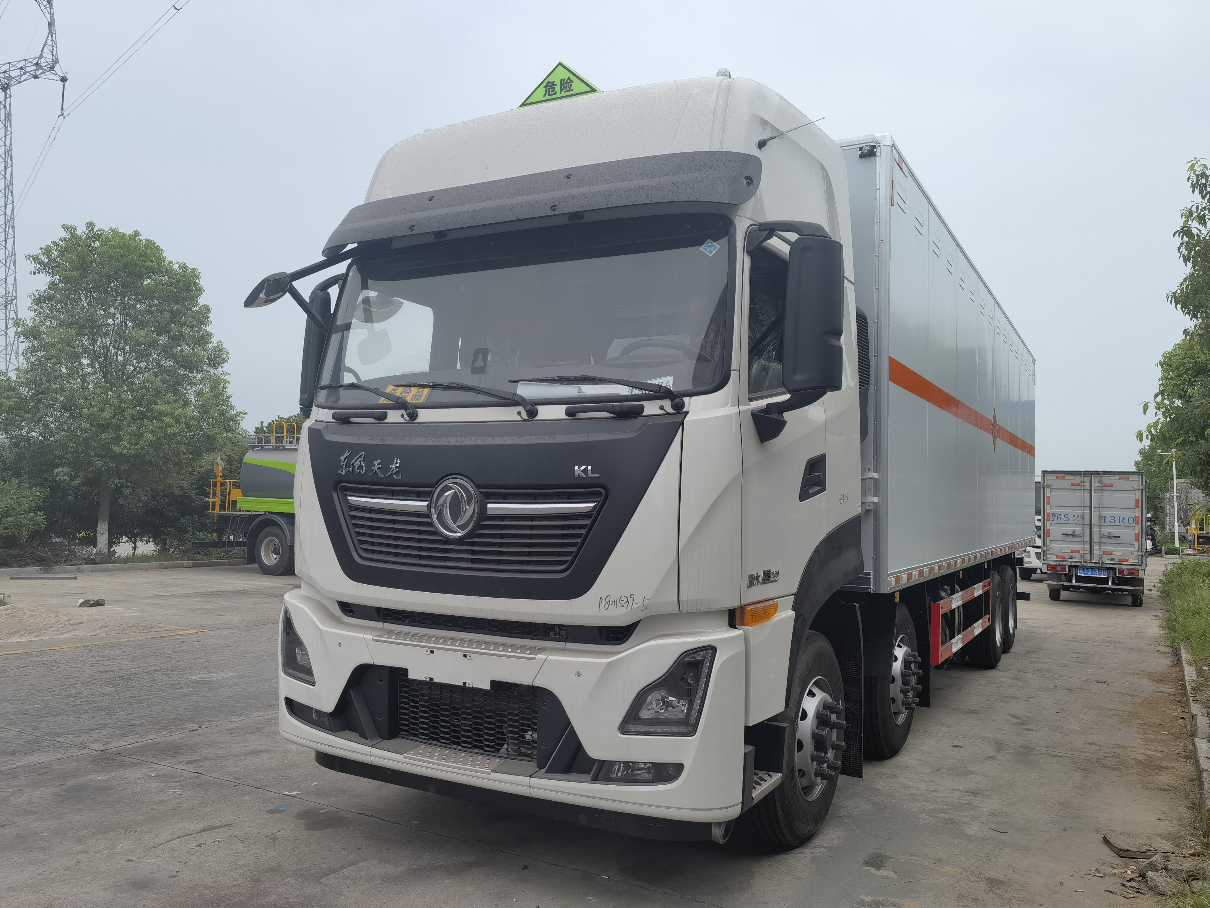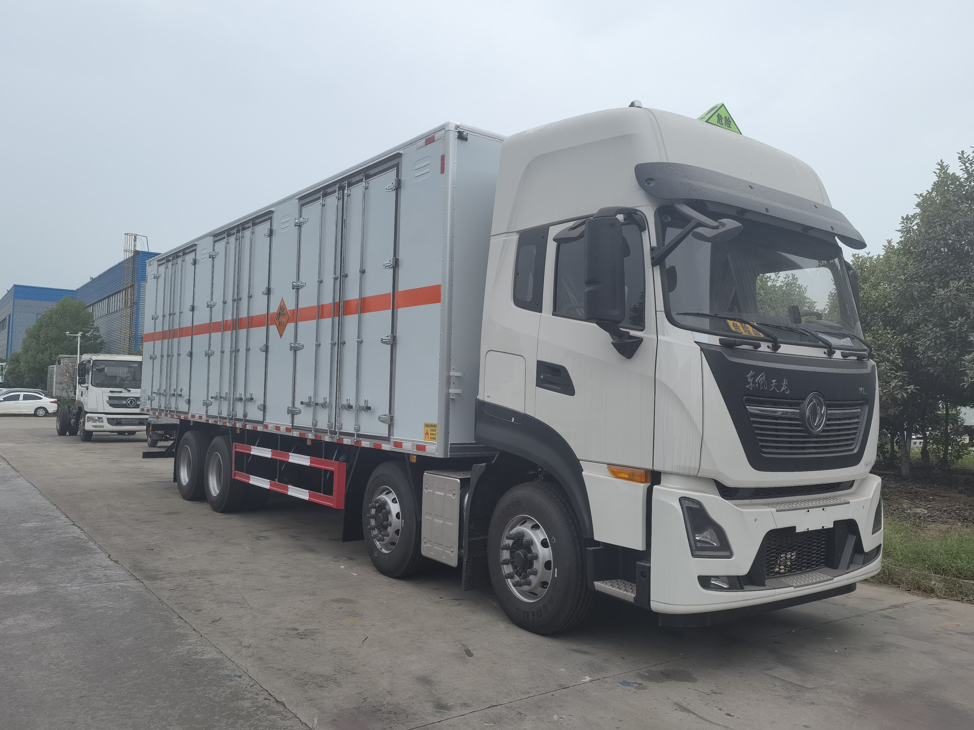 東風天龍前四后八國六煙花運輸車左側、右側,和后欄板栓鉤結構,可向下打開,方便上下貨物,車體為空曠式車型,大大減少了運輸物品因為狹窄空和強烈碰撞產生氣瓶爆炸的危險性,箱體外觀涂裝白色油漆,在欄板的中間位置粘貼橙色的危化車標帶,并在車體的左、右、后部粘貼“易燃氣體”或“不燃氣體”標識。駕駛室內部配備兩只滅火器,后保險杠處安裝防追尾事故的緩沖固定塊。此款車輛屬于國家規定的危險品二類倉欄式運輸車。