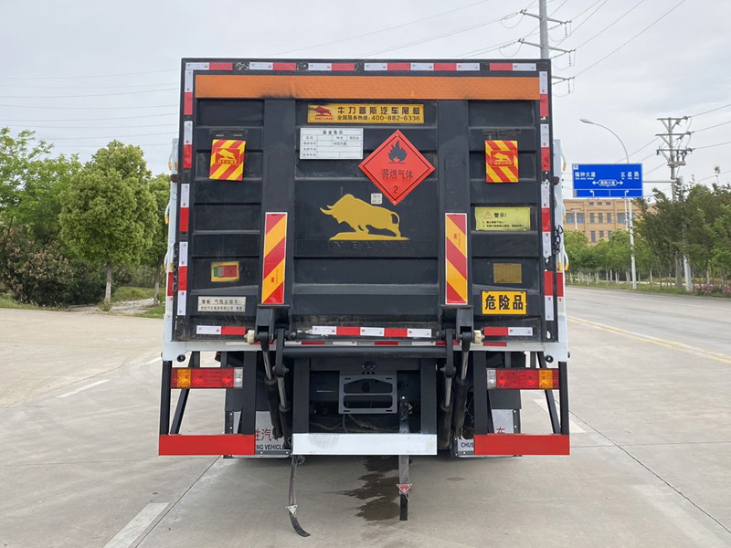 陜汽德龍單橋國六6米8氣瓶運輸車廂體邊板采用1.2mm冷板,底板花紋鋼板,花欄及花欄立柱可拆卸,底部立柱固定,底板上方鋪靜電膠皮,底板均做防銹處理,車廂一周粘貼橙色反光帶,箱體粘貼菱形標志牌,安全告示牌,危險品牌,拖地靜電帶。裝載噸位可達10噸,尾部可加裝液壓尾板,整車不超重。