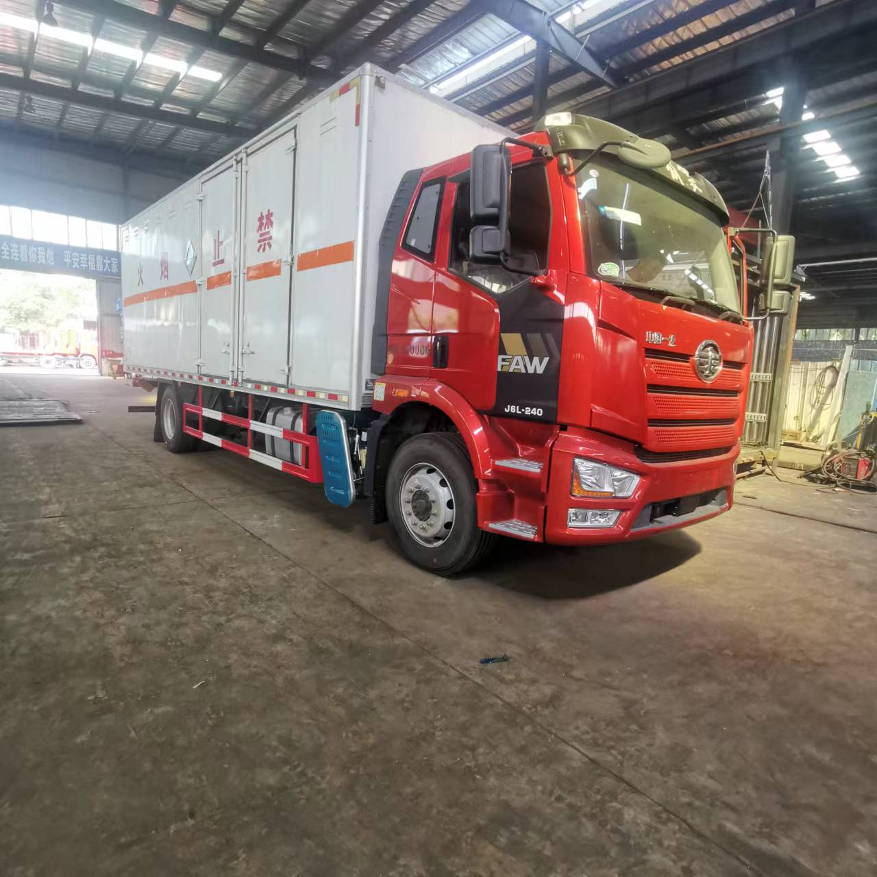 解放J6L國六6米8氧化性物品運輸車廂體材質采用內外玻璃鋼,中間聚氨酯保溫材料,后雙開門,廂體右側選裝中開單側門,底部采用花紋防滑板,門邊條采用迷宮式橡膠密封條,鋁合金型材包邊,不銹鋼包角,不銹鋼門鎖,不銹鋼門框及合頁,整車帶零下負15度冷藏機組,配備隨車工具,2個滅火器,三角頂燈,貼反光標識等。其他按公告標準制作。