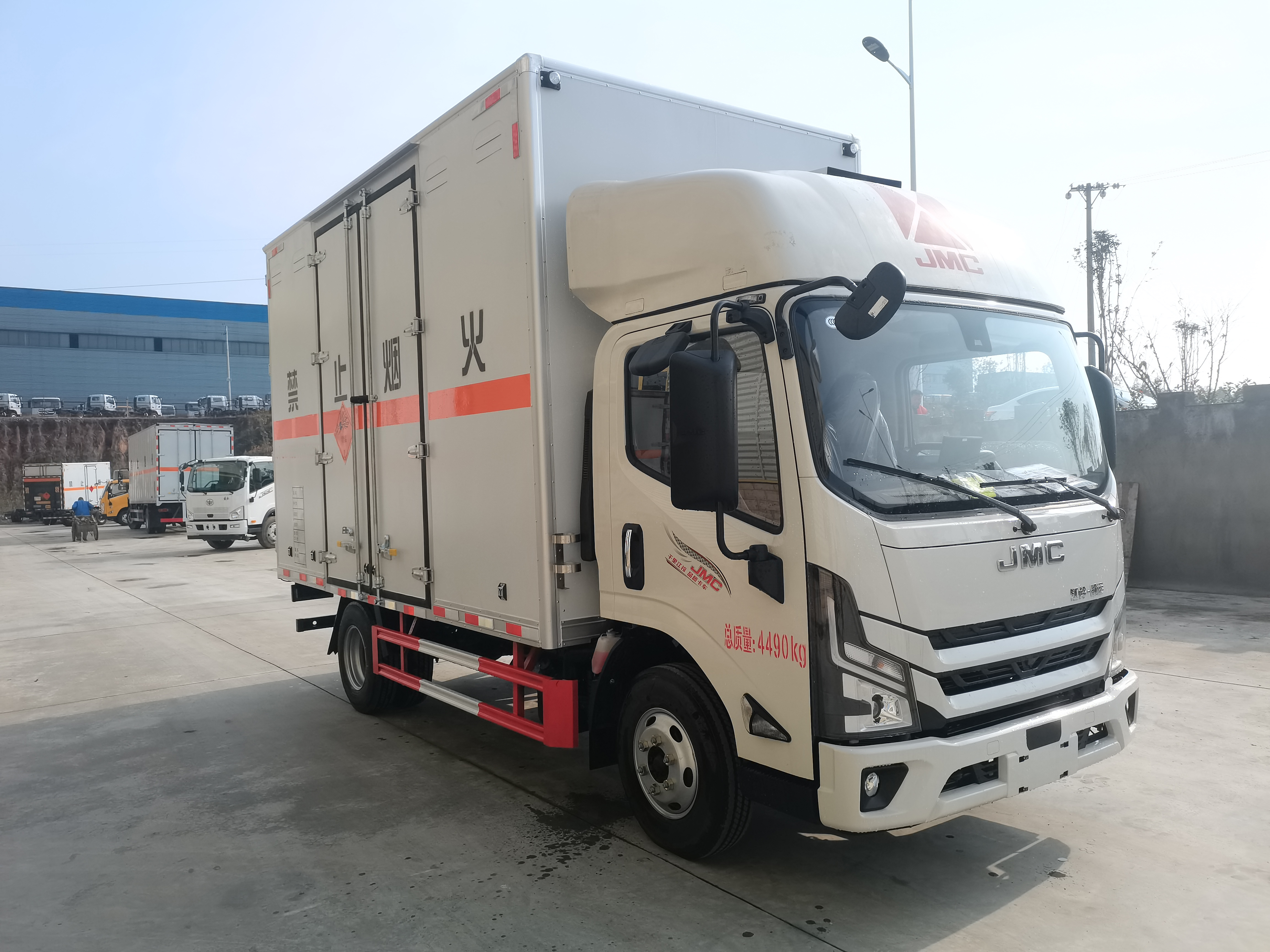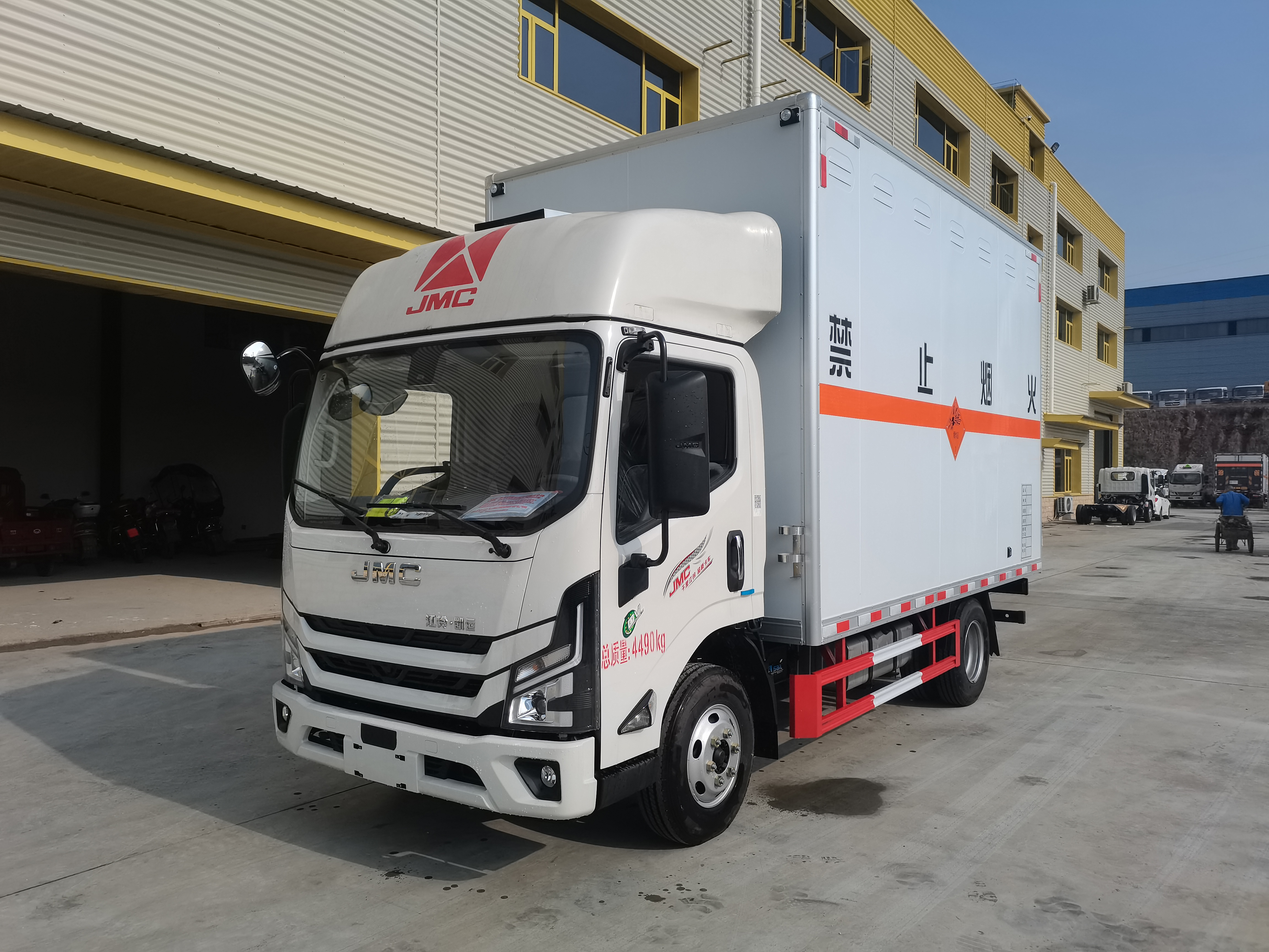 江鈴凱運寬體2米5高爆破器材運輸車貨箱尺寸:長:4200,4150 寬:2100,2050,2000 高:2600,2500,2400,2300,2200,2100,2000,1800,1700mm,總質量(kg):4490,額定載質量(kg):950,995,1050,1150整備質量(kg):3345,3300,3245,3145,廂體為雙層金屬結構,外板采用靜電屏蔽烤漆板,中間填充B1級阻燃泡沫,內飾為鋁板。廂體上側安裝防雨通風透氣孔。底板為花紋板,上鋪防靜電膠皮,廂體右側中開單側門。廂內兩側加裝固定貨物臥環,門框帶防盜報警器,頂部帶煙霧報警器。配備隨車工具,滅火器,三角頂燈,防靜電拖帶,貼反光標識等。其他按公告標準制作。