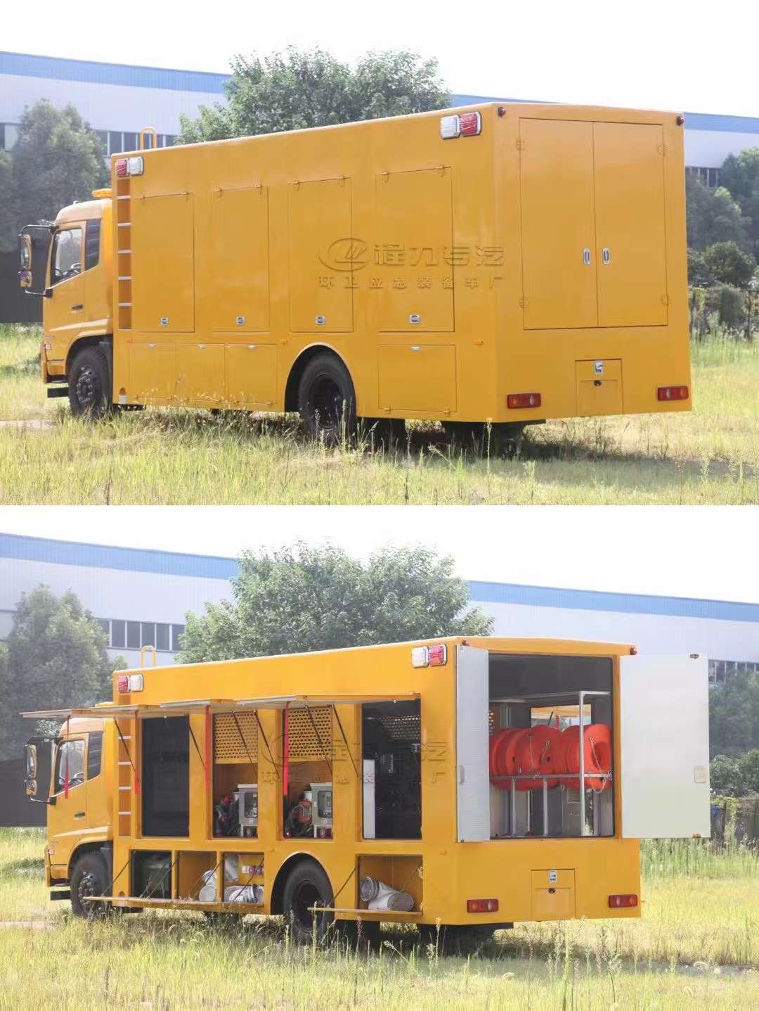 東風天錦3000立方救險排澇車,底盤配備康明斯230馬力發動機,上裝配備150千瓦發電機組,同時配6臺便攜式高速潛水泵,單臺水泵流量可達500m³/小時,總流量3000m³/小時,揚程10米,每臺泵配2根20米長 直徑20厘米的排水管。排澇車一般多用于梅雨季節汛期防汛的緊急搶險排澇,效果非常顯著,其優點排水量大、速度快,有效解決汛期難題。