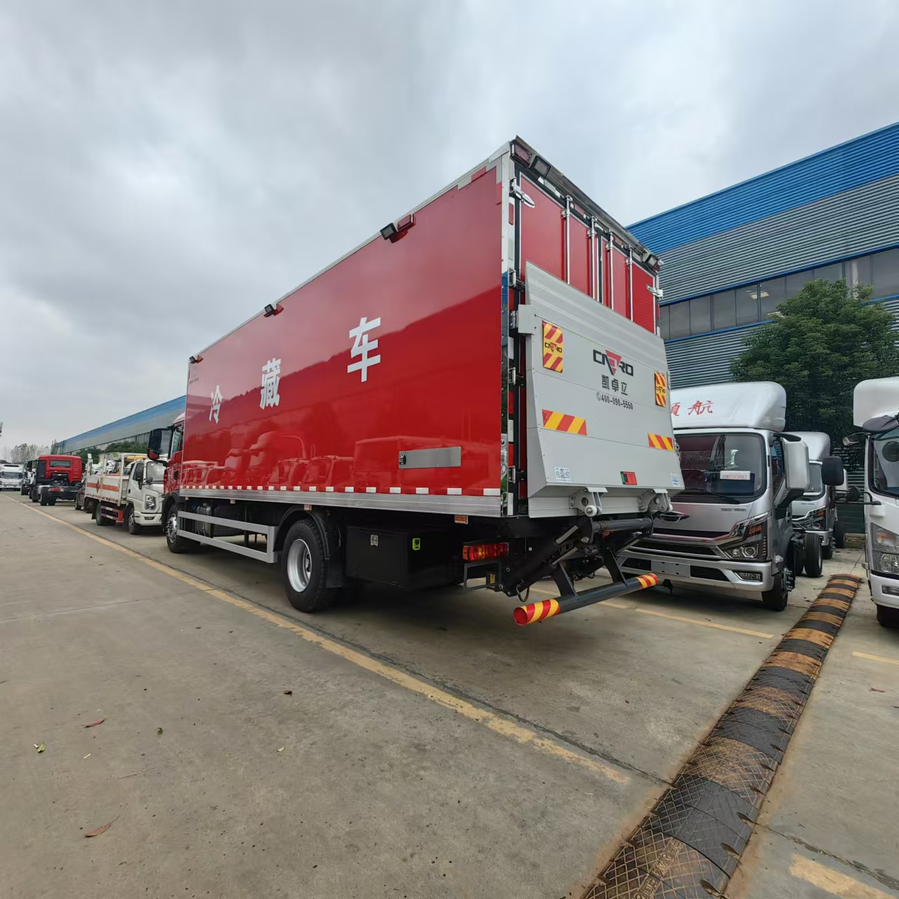 重汽豪沃國六消防紅冷藏車選用的G5S國六高頂雙駕駛室,懷擋變速箱,1094自調節臂前軸,MCJ09BG潤滑油調節臂,速比3.91,采用的是單層車架,圓柱形消聲器排氣系統,帶長效燃油粗濾器,帶275真空輪胎,600L油箱,匹配有四方位攝像頭,5200mm軸距。箱體全部采用的是免漆板工藝,內飾為保溫性能好的聚氨酯材料,尾部帶后尾門,加裝了凱卓立輕量化尾板,為了應對野外生產,該車外觀都加裝有爆閃燈和應急照明燈,加裝有備用電源,即使在野外也不用擔心用電問題,