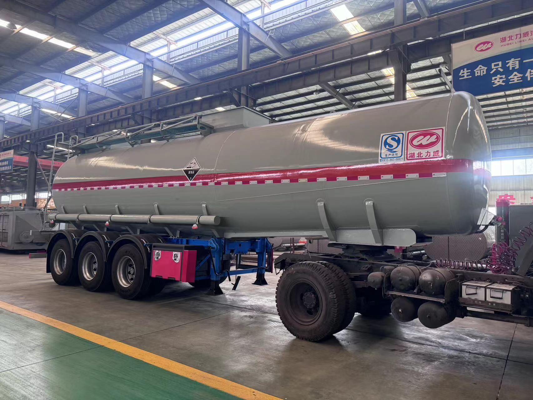 拉鹽酸專用分體式腐蝕品罐式車罐體總容量:28.19立方,額定載質量31150KG,外罐體材質為Q235B型4.2mm厚板材,封頭4.5mm厚,罐體通倉,內襯20mm厚聚乙烯,三道雙層鋼襯塑防浪板,兩個鋁合金歐標罐口蓋,罐口周圍用方盒子式圍邊,圍板內做防腐處理,罐體頂部帶活動舉升護欄,玻璃鋼方格走道,罐體尾底部帶一個DN100不銹鋼襯氟海底閥(海底閥帶聲光報警裝置),罐體后尾部左右各一個DN80襯氟球閥為出料口帶全塑保護箱,大梁下出料,一個工具箱,尾部爬梯。兩根卸料管,兩個8KG滅火器,其余標配。