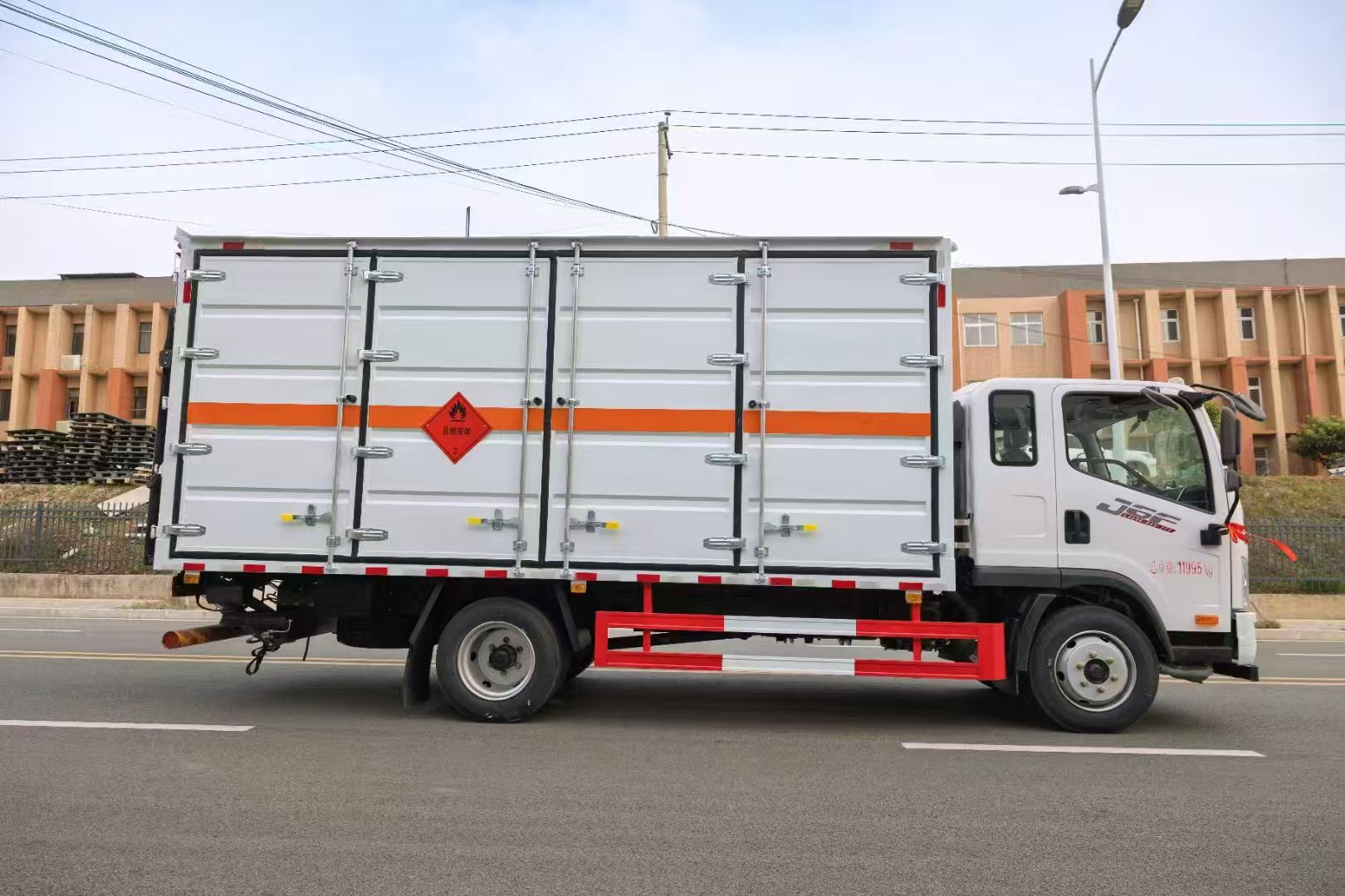解放J6F帶全開門易燃液體廂式車采用的是危險(xiǎn)品專用底盤,J6F(2010)單排駕駛室,大柴CA4DD2-18E6,陜齒8JS75C,325GH后橋(6噸后橋,16L尿素箱,帶國產(chǎn)ABS,液晶儀表,電加熱后視鏡,150L鋁合金油箱,板簧7/10+4,高架箱,空調(diào)+電動門窗+中控鎖,前后橫向穩(wěn)定桿,后處理器前置+排氣火花熄滅器+前盤后鼓制動器+限速79KM/H+前碰撞預(yù)警+車道偏離輔助預(yù)警,北斗+GPRS行車記錄儀,帶靜電拖地帶,爆胎應(yīng)急安全裝置,危化專用底盤。整車尺寸 7100×2550×3270(mm),廂體尺寸 5200X2400x2100。額載噸位7噸,裝貨多不容易超載。采用瓦楞板箱體,底板為4mm花紋板上鋪防靜電膠皮,廂體右側(cè)全部開門。底部橫梁加密25左右,門框帶防盜報(bào)警器,頂部帶煙霧報(bào)警器。其他按標(biāo)配制作,配備隨車工具。