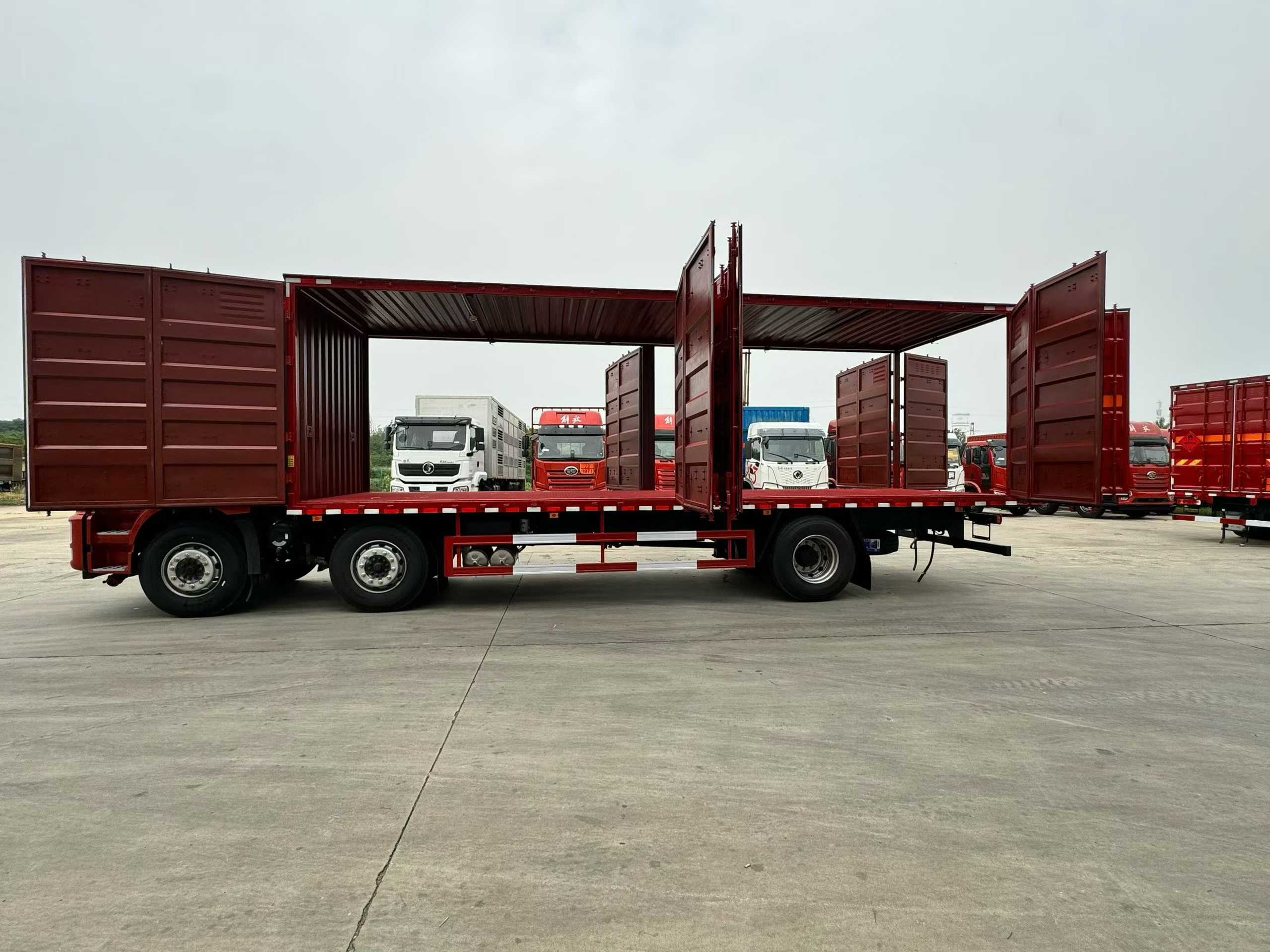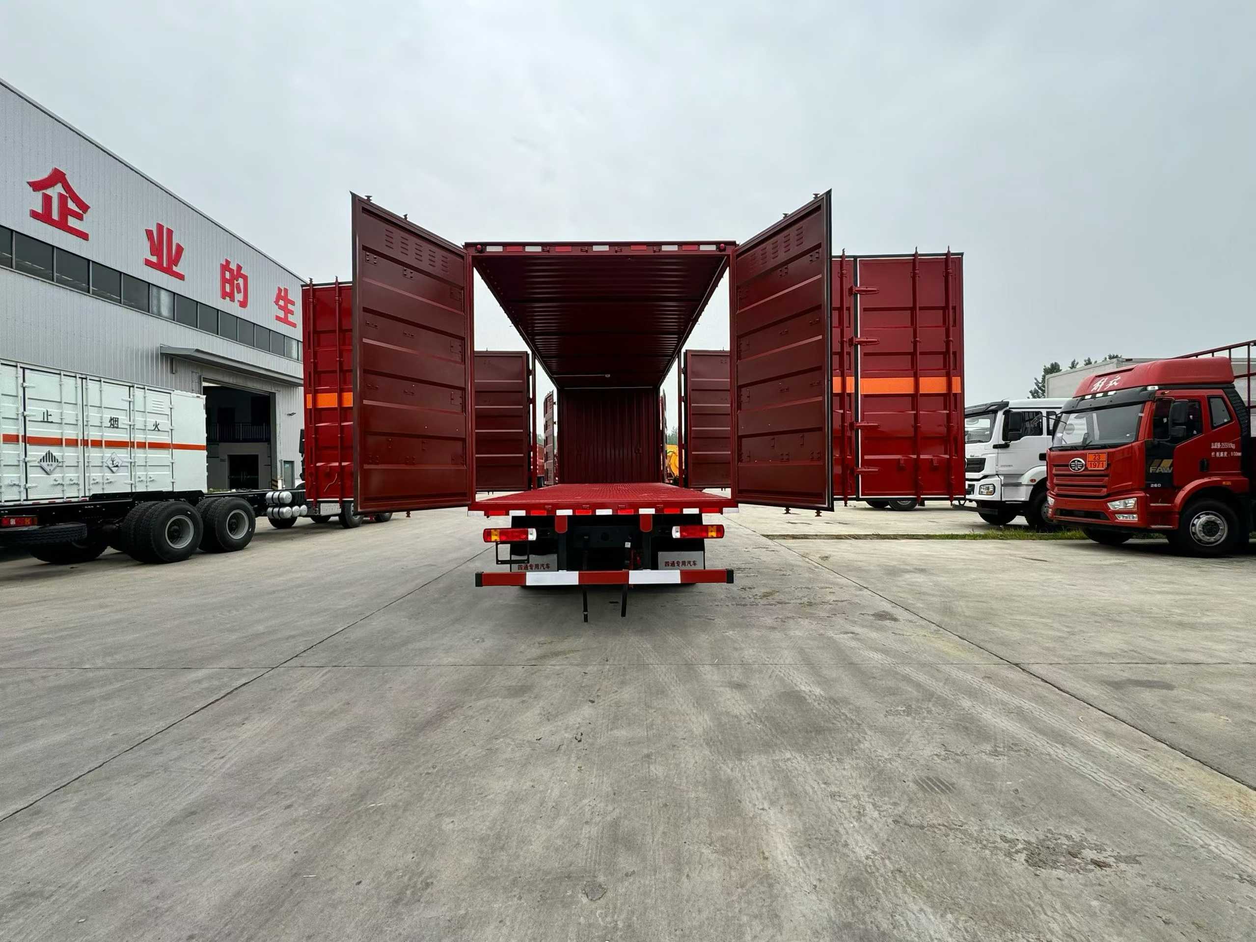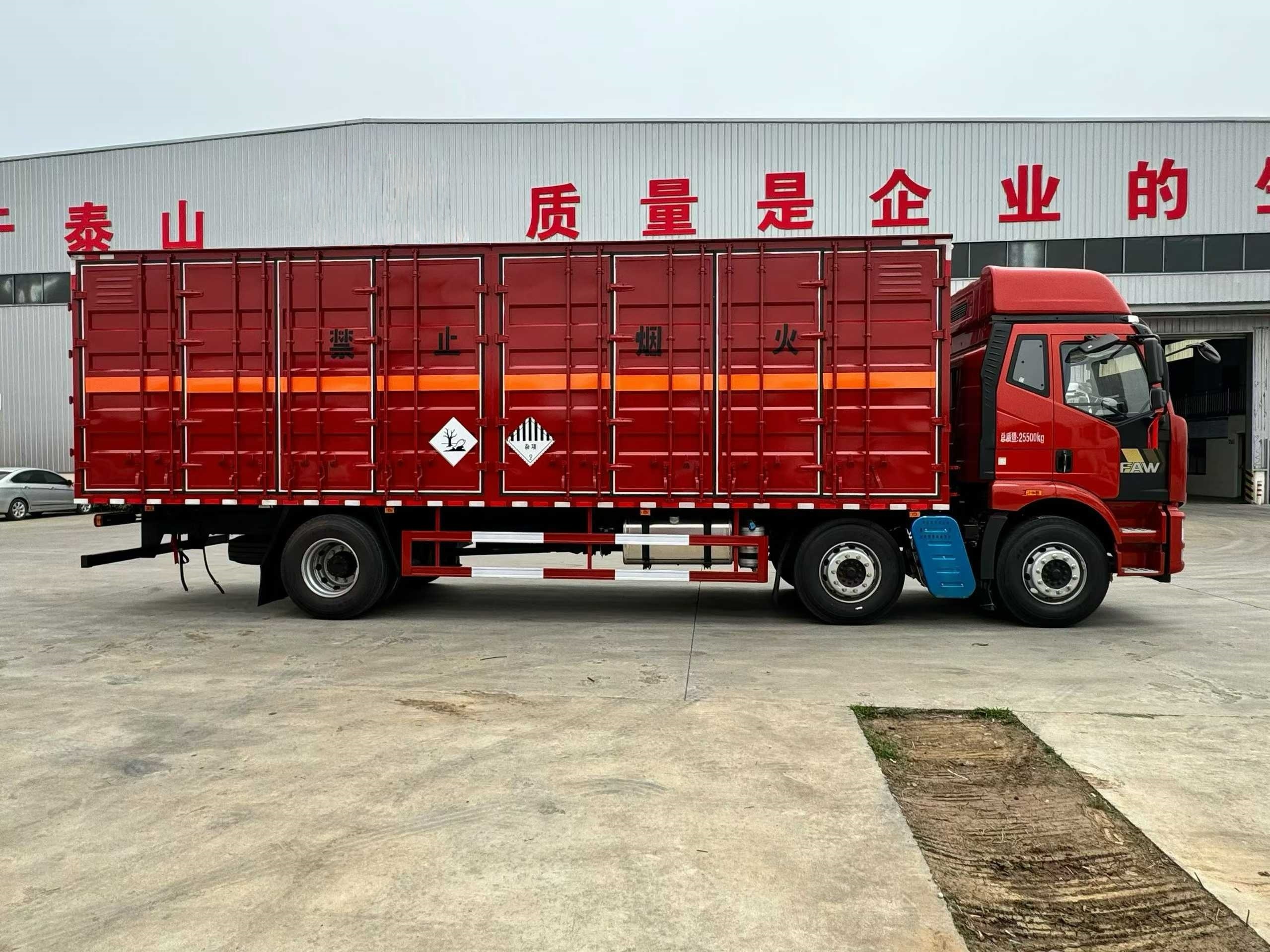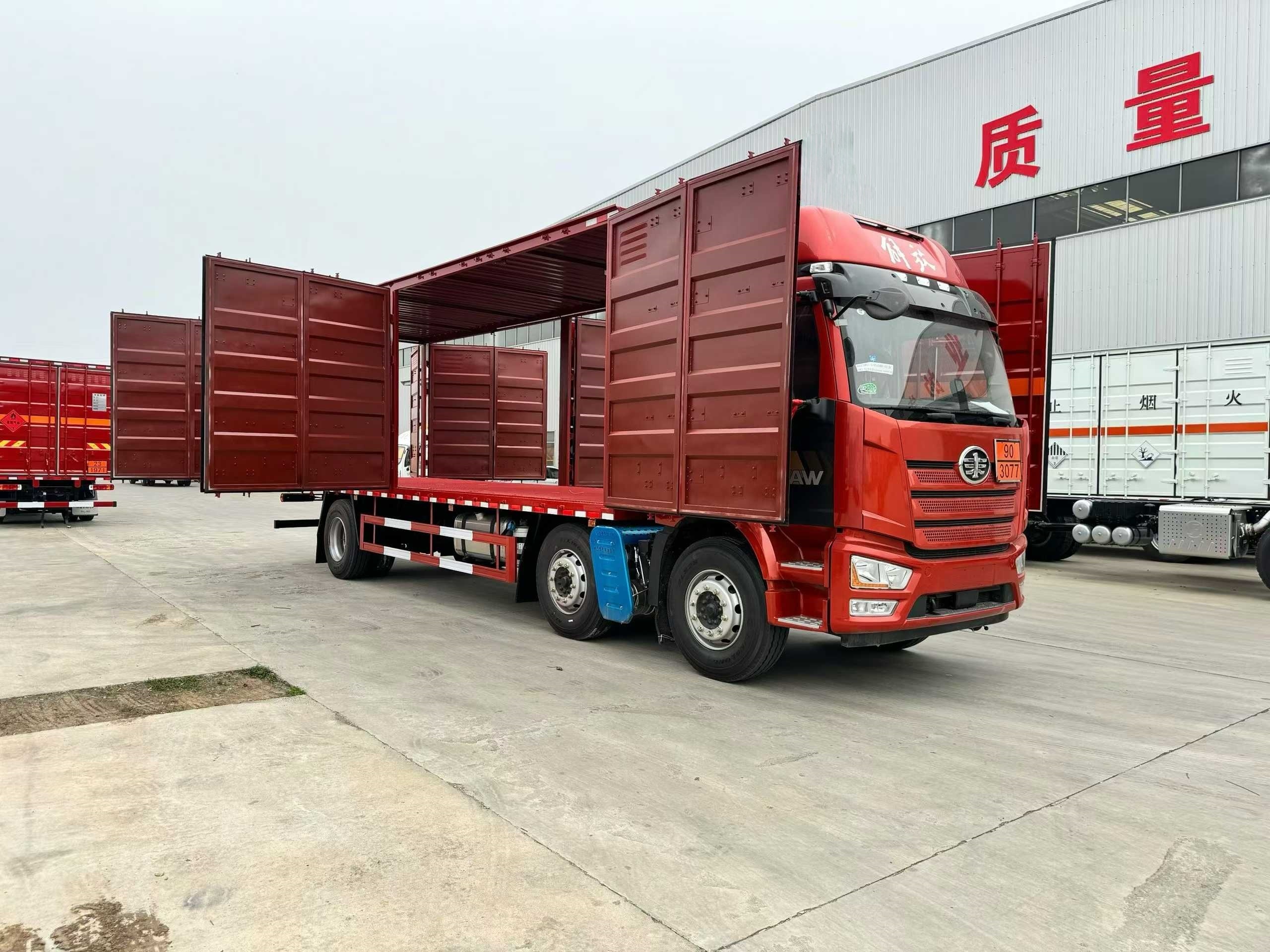 解放J6L前四后八四開門危險品車選用的是時尚的外形,高頂雙臥的駕駛室,上下臥鋪寬敞,重點是針對長途運輸,該款車型駕乘非常舒適。采用新 J6L 全浮高頂排半駕駛室,具備較好的舒適性和空間表現。配備液晶儀表,方便駕駛員讀取車輛信息;支持電動玻璃升降、電動后視鏡 ,操作便捷;設有后圍窗簾導軌、全景窗簾導軌,提升駕駛室內的遮光隱私性;駕駛員座椅為空氣減振座椅,能有效緩解駕駛過程中的顛簸感,減輕駕駛疲勞。此外,還帶有單 DIN 北斗兼容車載系統、電源總開關控制開關等配置。廂體為雙層金屬骨架結構,外部為冷扎鋼板,具有較好的強度和防護性;內壁采用鋁合金板蒙面,夾層填充隔熱阻燃料,起到隔熱、防火的作用。如需安裝抗暴容器則增開側門,側壁設有防雨功能自然通風窗,保證廂內空氣流通,同時防止雨水進入。底部鋪有阻燃導靜電膠板,可及時導走靜電,避免靜電引發危險。貨箱尺寸:9600*2450*2700mm。廂體內部前面和側面裝有固定拉環,與捆綁帶配合使用,固定貨物,避免貨物在運輸過程中移動。安裝感煙報警器,感測車廂內火情,當有火情煙霧出現時,在駕駛室進行蜂鳴報警;門器框上方安裝防盜報警器(可根據用戶要求選裝防盜監視器 ),廂門被打開時,駕駛室內的蜂鳴器發出報警音,不使用時可關閉駕駛室內的控制開關,保障運輸過程中貨物的安全。