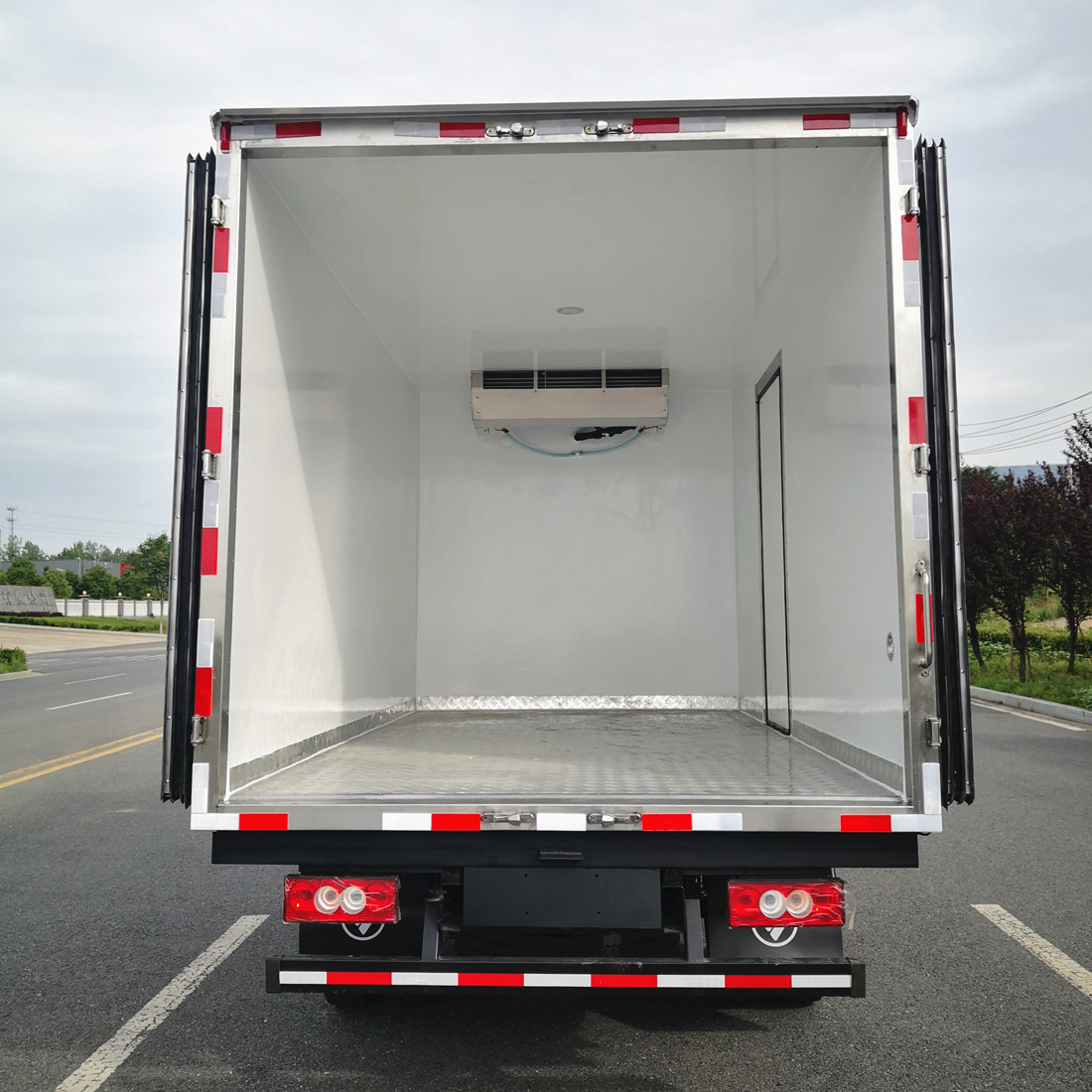 1.選裝導流罩;選裝兩側單、雙、無側開門;選裝同等功率制冷機組,外觀形狀可不同.2.ABS型號及廠家對應關系:液剎:ABS系統型號:YF8;生產企業:武漢元豐汽車電控系統有限公司.氣剎:ABS系統型號:ABS-VI.E;生產企業:廣州瑞立科密汽車電子股份有限公司.3.F2.8NS6B131、F2.8NS6B156發動機最大凈功率分別為93kw、112kw.4.選裝前圍及前部燈具,前下視鏡為選裝件可不裝,選裝排半駕駛室,排半駕駛室對應貨箱內部長度為3700mm,單排駕駛室對應貨箱內部長度為4080mm.5.側防護的連接方式是與貨箱橫梁螺栓連接,側防護材料為冷板B-2.0/20,選裝材料為20號鋼的側防護、選裝鋁合金6061-T6側防護.后防護連接方式是與車架縱梁螺栓連接,后下部防護裝置材料為Q345A,選裝材料為AL6082-T6的后下部防護裝置,后部防護裝置截面尺寸100×50mm,后防護距離車輛離地高度470mm;選裝后部防護選裝圓形管Q345A,裝置截面尺寸為直徑120mm,離地高度:485mm.6.發動機F2.8NS6B131對應油耗值為10.8;7.貨廂頂部封閉,不可開啟.選裝液壓尾板,液壓尾板質量為350kg,液壓尾板收起狀態下的水平長度為280mm.