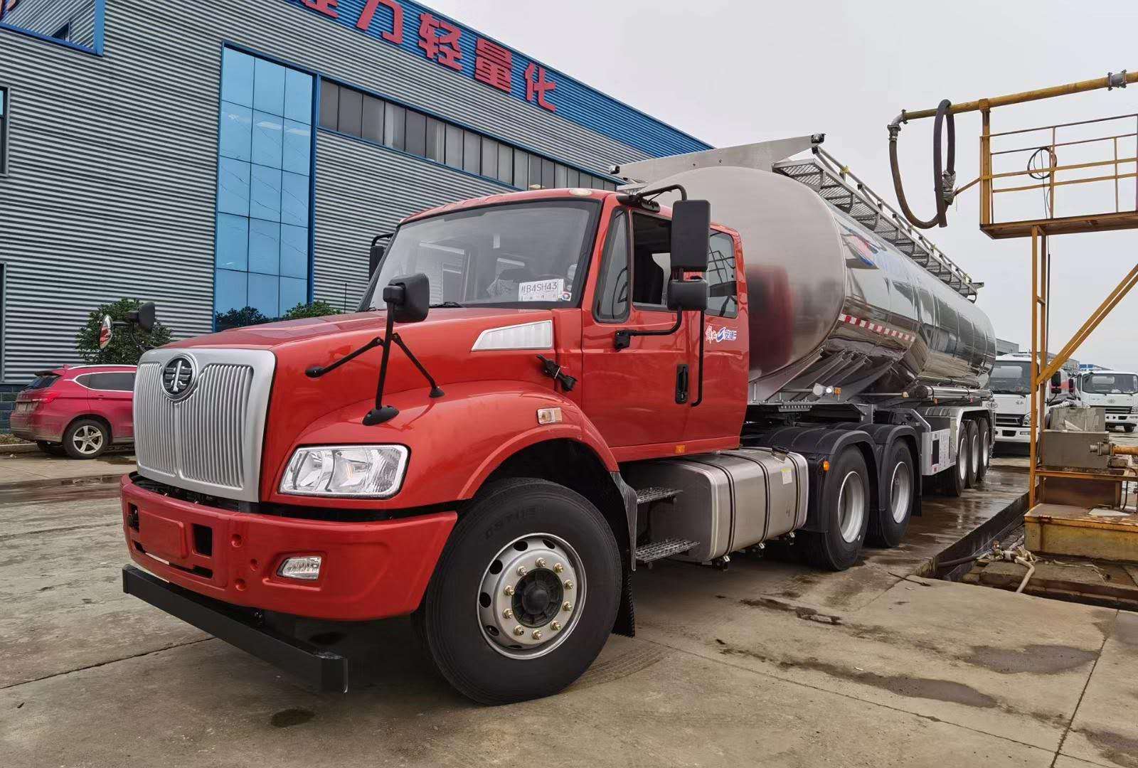 一汽解放尖頭牽引車(chē)帶鋁合金半掛油車(chē)看起來(lái)像極老爺車(chē),給人不一樣的體驗(yàn)感!河北吳總在我司訂購(gòu)的牽引頭帶鋁合金半掛油車(chē)已完工,以下是具體實(shí)拍: