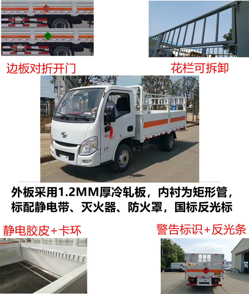 廂體配置:貨廂尺寸為3300X1650X600(mm)、邊板對折四開門、外板采用1.2MM厚冷軋板,內襯為矩形管骨架牢靠穩定,底板為3mm厚花紋板,有靜電帶、滅火器、防火罩。整車國標反光標示及警告標志;