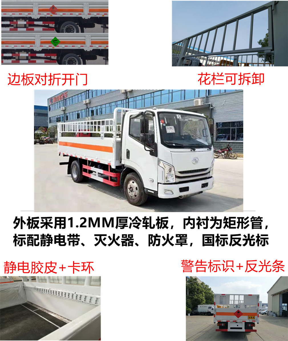 躍進依維柯高欄式氣瓶運輸車,它是根據國家有關部委對易燃氣體鋼瓶運輸的規范和用戶的要求而研制生產,產品符合國防科工委關于《氣瓶運輸車安全技術條件》的要求.具有廂體強度高、防火阻燃、防止靜電火花等主要功能.專業運輸各類氣體介質瓶裝轉運,如:液化石油氣瓶運輸車、鋼瓶配送車、煤氣瓶轉運車、氧氣瓶、二氧化碳氣瓶等。