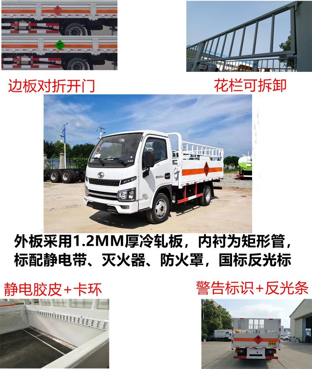 廂體配置:貨廂尺寸為3360×1615,1715,1850×550(mm),邊板對折四開門、外板采用1.2MM厚冷軋板,內襯為矩形管骨架牢靠穩定,底板為3mm厚花紋板,有靜電帶、滅火器、防火罩。整車國標反光標示及警告標志;
