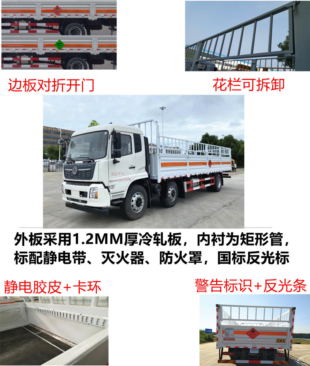 上裝配置:嚴格按照公告尺寸制作,邊2底4材質,底板上鋪靜電膠皮,側板平板內置臥環,側板上帶可卸式高欄,配備滅火器,三角頂燈,靜電拖帶等,嚴格按照國家危險品法規進行“易燃氣體”標識粘貼等