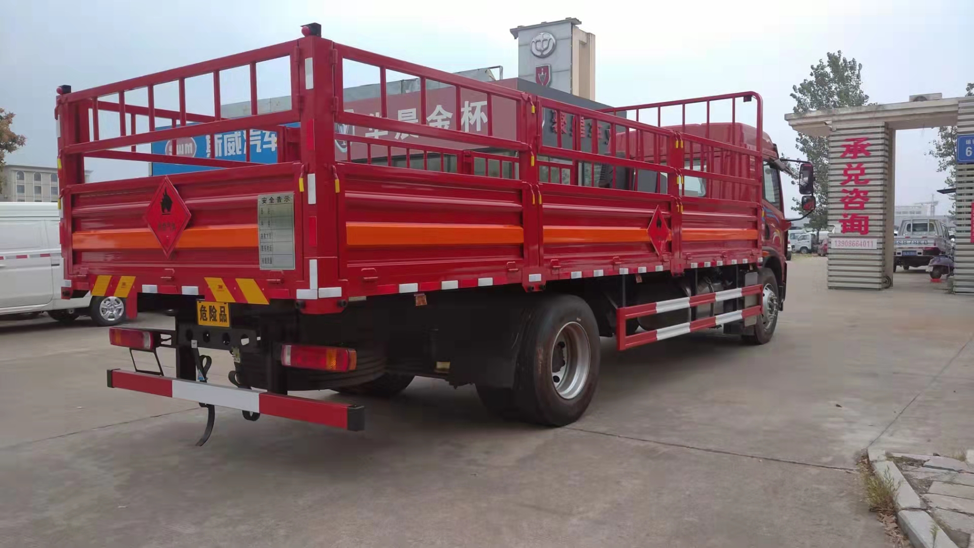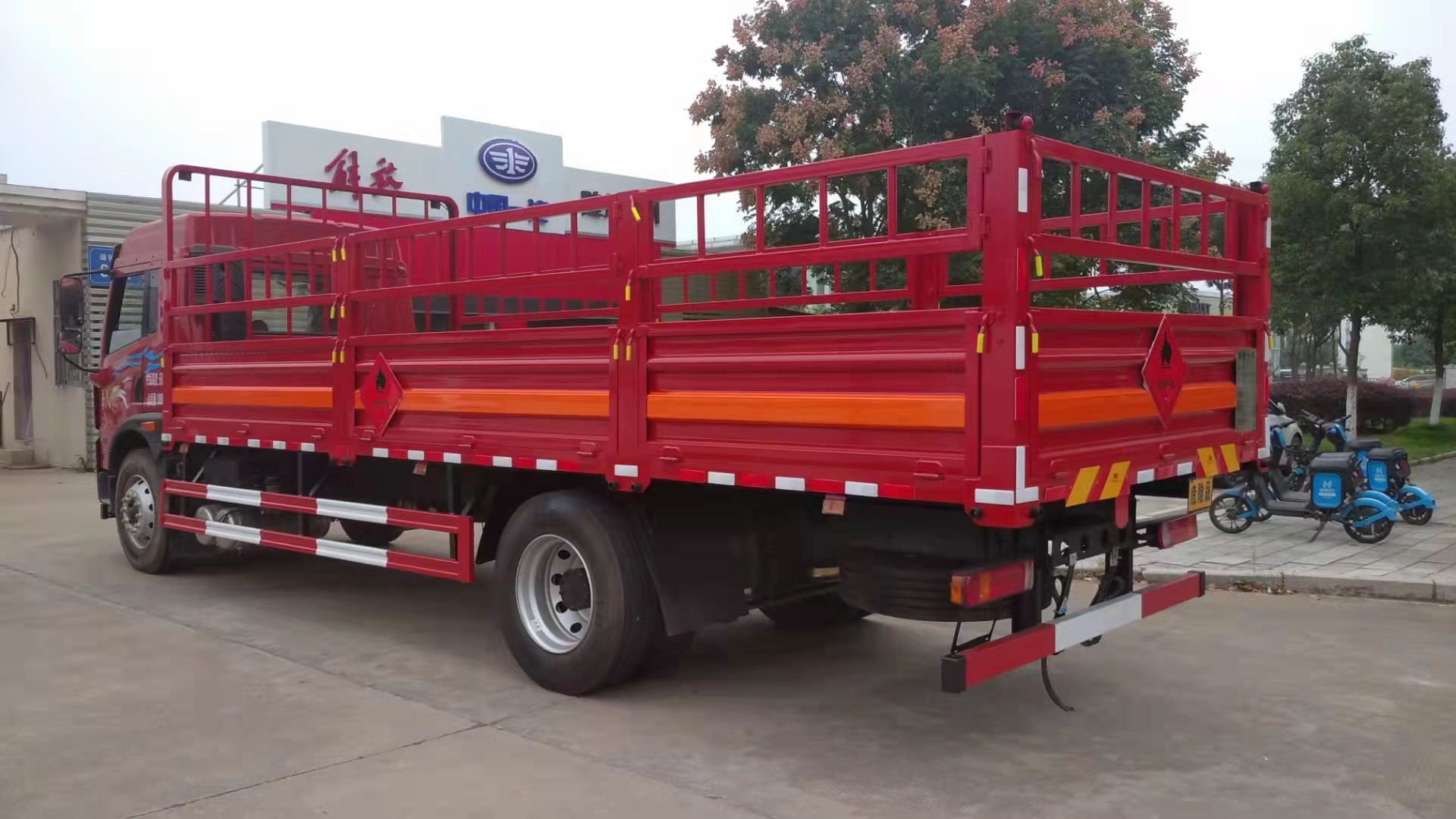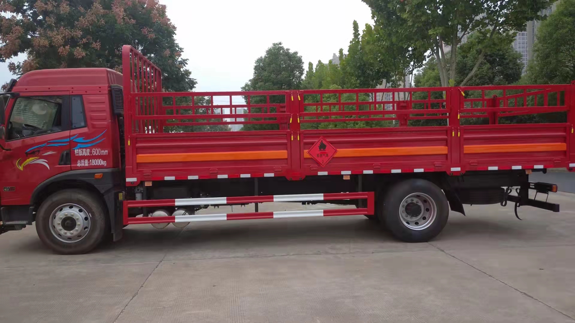 安裝有限速裝置;安裝有具有衛(wèi)星定位功能的行駛記錄儀;運輸獨立容器(瓶)包裝的貨物;AT型車輛;ABS型號:VIE ABS-II;ABS生產(chǎn)企業(yè):浙江萬安科技股份有限公司;限速裝置限速(km/h):80;.選裝多種平板及瓦楞結構的箱體和有無柵欄樣式.運輸?shù)臍馄渴⒀b介質(zhì)2.1項易燃氣體時,車輛左、右側及后部粘貼“易燃氣體”標示牌,運輸?shù)臍馄恐惺⒀b介質(zhì)2.2項非易燃無毒氣體時,車輛左、右側及后部粘貼“不燃氣體”標示牌.該車可選裝ETC車載裝置.僅選用5250mm軸距底盤;發(fā)動機/油耗值(L/100km)對應關系為:CA6DLD-22E6/26.5;側后防護情況:后部不帶液壓尾板時后防護裝置材料:Q235,連接方式為焊接,后防護截面尺寸(mm): 120×60,下邊緣離地高490mm,選裝后部帶液壓尾板時,側/后防護材料為Q235,連接方式焊接連接,后防護截面尺寸(mm):120×60,離地高度470mm;尾板、上下坡道(或類似裝置)收起狀態(tài)的水平長度(mm):液壓尾板為選裝件,選裝液壓尾板時收起狀態(tài)的水平長度為298mm,尾板質(zhì)量為550kg(不計整備質(zhì)量之內(nèi));專用功能及裝置:該車為危險品運輸車輛;危險貨物類項號:該車運輸具有獨立容器包裝的易燃氣體(類項號為2.1);運輸具有獨立容器包裝的非易燃無毒氣體(類項號為2.2);其他說明:僅采用裝配前輪盤式制動器、前置排氣管、子午線輪胎、后軸裝配空氣懸架、轉向輪安裝輪胎爆胎應急防護裝置的底盤; |