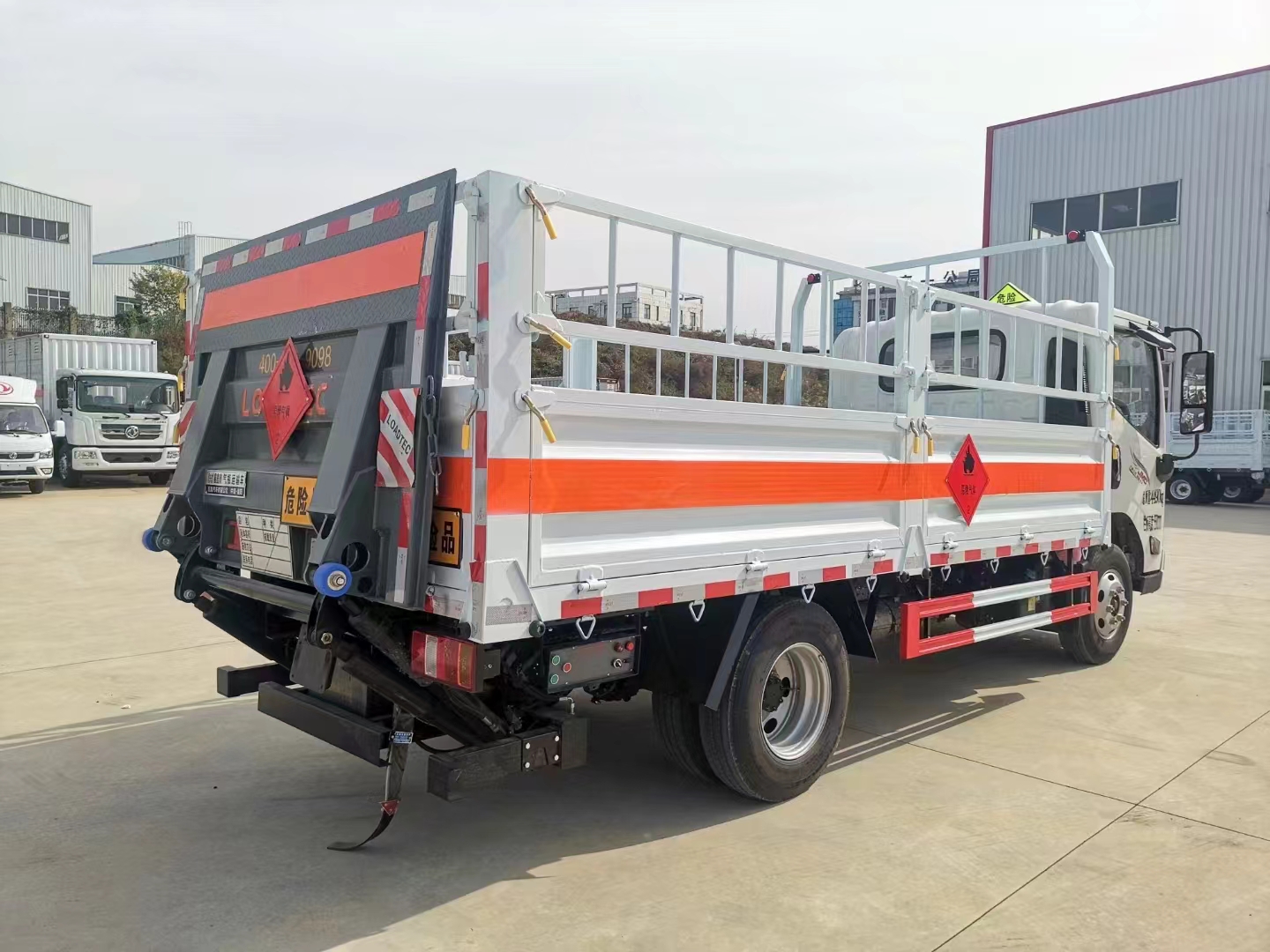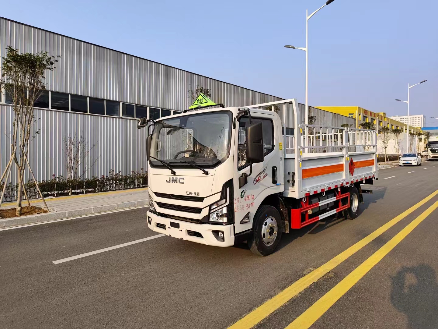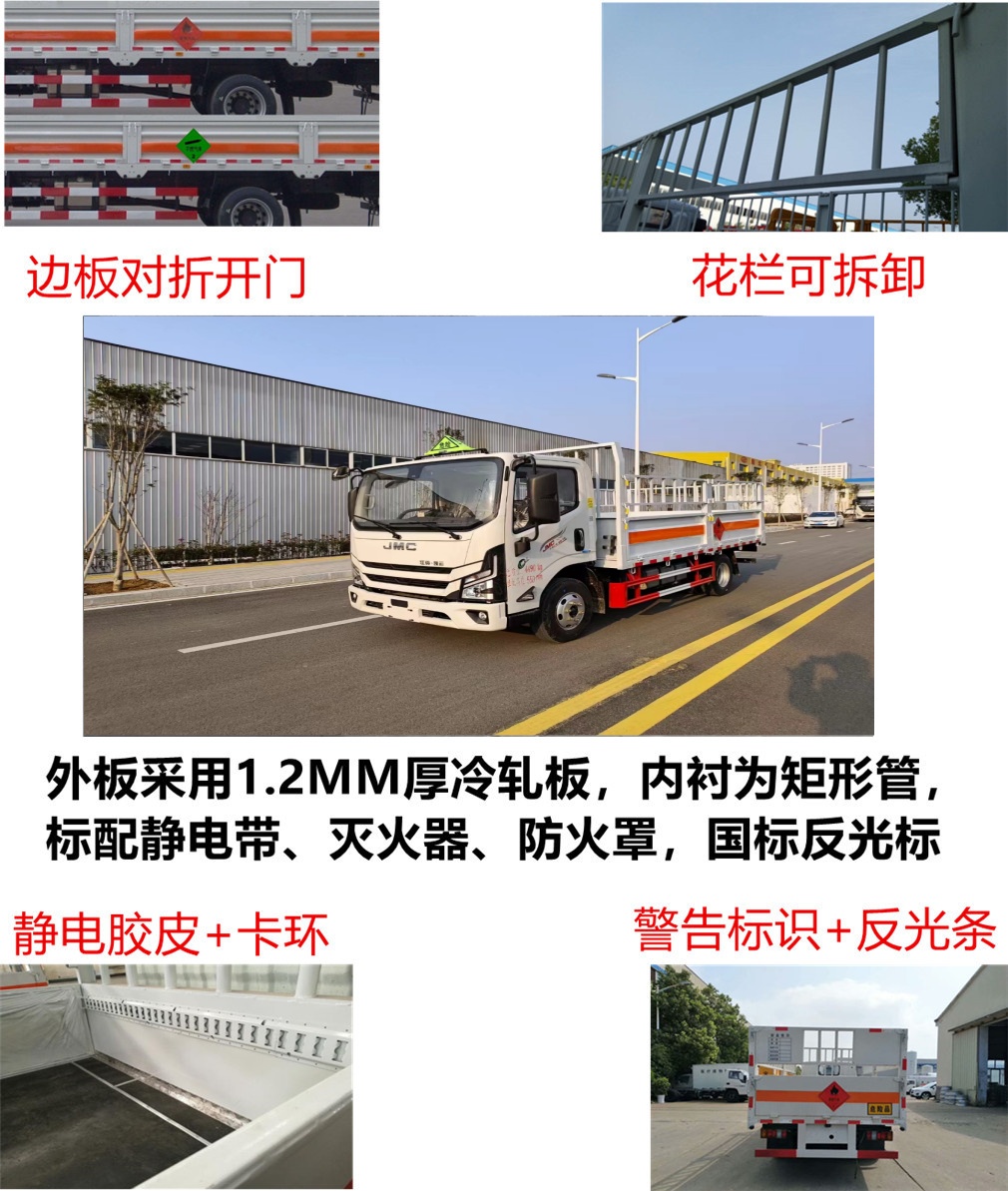 該車為危險品運輸車,運輸獨立容器(瓶)包裝的貨物;危險貨物類項號:2.1,2.2;運輸易燃氣體時掛2.1類警示牌,運輸非易燃無毒氣體時掛2.2類警示牌;僅選用3360mm軸距;發動機/油耗申報值(L/100km)對應關系為:D25TCIF1/10.69,D25TCIF5/10.66,JX4D25B6H/10.24,JX4D256H/10.51,JX493ZLQ6F/10.32;側防護材質為Q235,螺栓加焊接連接;裝有液壓尾板時后防護材質為Q235,焊接連接,斷面尺寸(寬×高):50×100(mm),離地高度:340mm;尾板收起狀態水平長度為280mm,尾板質量為350kg;選裝氣、液剎制動,氣剎ABS系統型號/生產企業:VIE ABS-II/浙江萬安科技股份有限公司,液剎ABS系統型號/生產企業:3550B500/浙江亞太機電股份有限公司;僅采用前輪盤式制動器,前置排氣管,子午線輪胎,靜電帶,限速裝置的底盤,限速80km/h;轉向輪安裝爆胎應急防護裝置; |