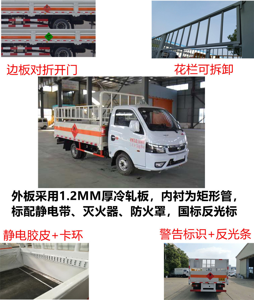 上裝配置:貨箱尺寸:3180×1650×550(mm) 邊板對折四開門、外板采用1.2MM厚冷軋板,內襯為矩形管骨架牢靠穩定,底板為3mm厚花紋板,有靜電帶、滅火器、防火罩。整車國標反光標示及警告標志。