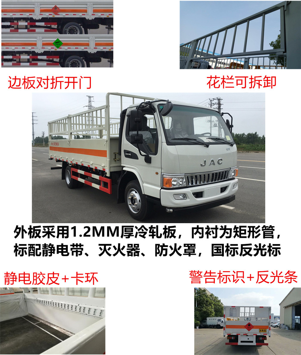 江淮駿鈴高欄式氣瓶運輸車,它是根據國家有關部委對易燃氣體鋼瓶運輸的規范和用戶的要求而研制生產,產品符合國防科工委關于《氣瓶運輸車安全技術條件》的要求.具有廂體強度高、防火阻燃、防止靜電火花等主要功能.專業運輸各類氣體介質瓶裝轉運,如:液化石油氣瓶運輸車、鋼瓶配送車、煤氣瓶轉運車、氧氣瓶、二氧化碳氣瓶等。