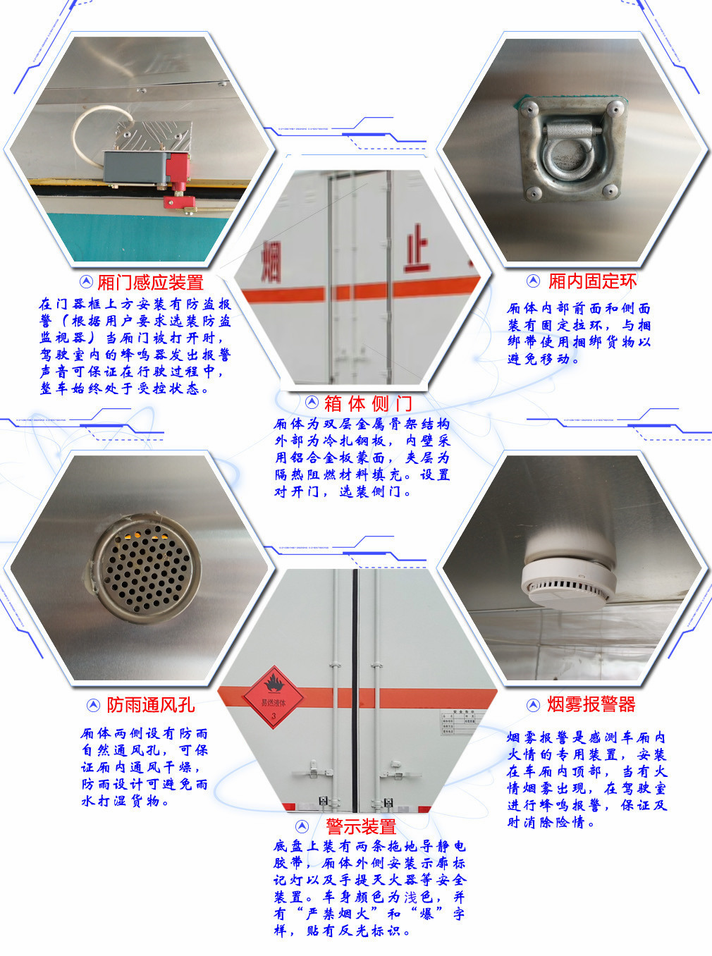 上裝廂體配置:為雙層金屬骨架結(jié)構(gòu),外冷軋鋼板內(nèi)飾鋁板,內(nèi)壁采用鋁合金板蒙面,夾層為隔熱阻燃材料填充,廂體內(nèi)部做通風(fēng)窗口,中開側(cè)門,廂體內(nèi)部做防靜電處理,廂體底部鋪導(dǎo)靜電膠板,車輛副梁配備導(dǎo)靜電帶,廂體內(nèi)襯壁裝單排臥環(huán),廂體內(nèi)頂部安裝煙感報警器,廂體安裝防盜報警器。隨車配備手提滅火器,危險品三角頂燈,防護帽等,嚴(yán)格按照國家危險品法規(guī)進行“氣體”標(biāo)識粘貼等。隨車提供資料:機動車購車發(fā)票,整車合格證,隨車工具,服務(wù)手冊,保修手冊。