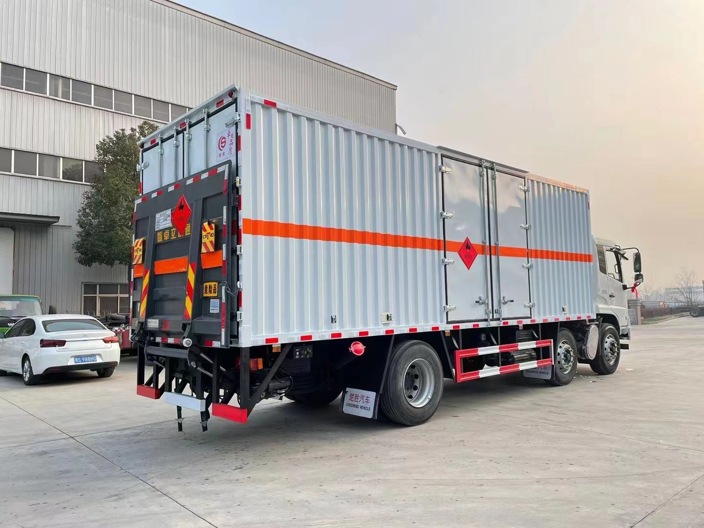 | 專用功能說明 | 1、該車為危險品運(yùn)輸車.運(yùn)輸具有**容器(瓶)包裝的易燃液體物品.運(yùn)送危險物品類項號:3類.廂體頂部封閉不可開啟.2、側(cè),后防護(hù)材料均為Q235,側(cè)方護(hù)螺栓連接,后防護(hù)焊接,后防護(hù)截面尺寸(mm)120×60,下邊緣離地高490mm.3、僅選用排氣管前置、限速裝置(限速80km/h)、前輪盤式制動及子午線輪胎的底盤,轉(zhuǎn)向輪安裝輪胎爆胎應(yīng)急防護(hù)裝置.后軸采用空氣懸架.安裝帶有衛(wèi)星定位功能的行駛記錄儀.EBS型號/廠家:EBS5/東科克諾爾商用車制動系統(tǒng)(十堰)有限公司.發(fā)動機(jī)/油耗值(L/100km)對應(yīng)關(guān)系為:B6.2NS6B230/36.1,B6.2NS6B245/36.1.整車長度/軸距/后懸對應(yīng)關(guān)系為(mm):10180/1995+4200/2555,11080/1995+5000/2655.隨底盤選裝駕室.該車型可選裝ETC車載裝置.廂體側(cè)面選裝開門型式及位置,選裝不帶側(cè)開門,選裝貨廂平面或瓦楞結(jié)構(gòu);廂體側(cè)面板選裝開百葉窗,選裝后部樣式.選裝尾板,尾板質(zhì)量為550kg,尾板收起狀態(tài)水平長度為290mm。選裝制冷機(jī)組,選裝后處理隔熱罩。 | ||