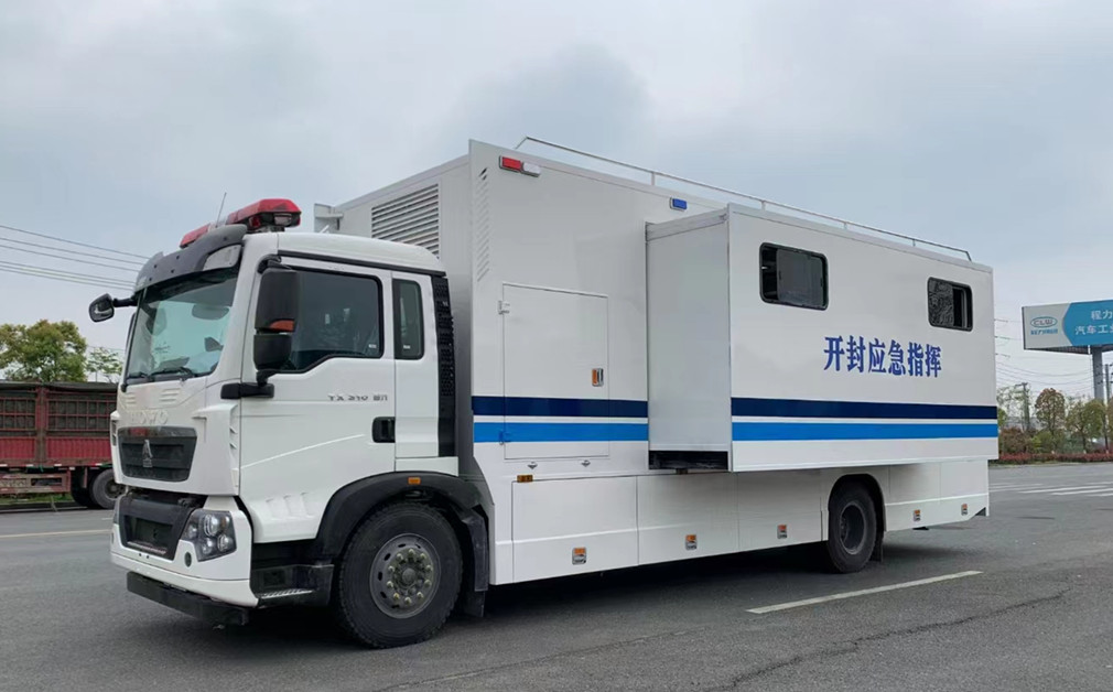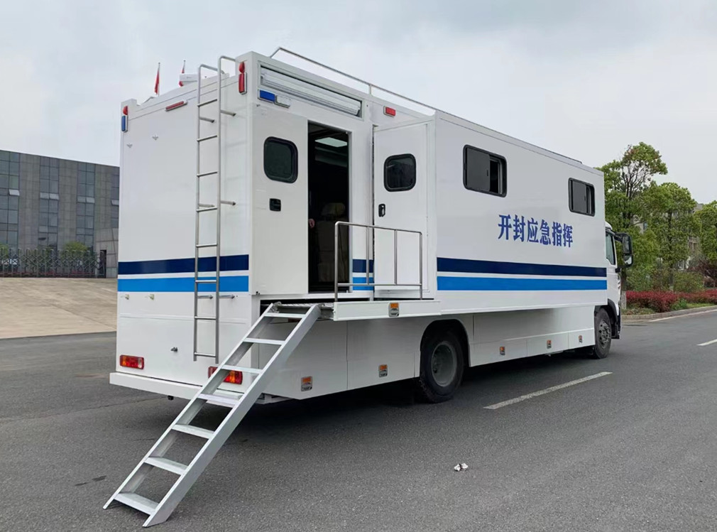 采用重汽豪沃4×2底盤,車輛長度10630mm;車內配備9人會議桌椅,另配6個壁掛式折疊桌椅,廂體前面發電機倉與會議室隔開,廂體尾部為控制室。廂體按空間區域分為前壁艙,乘、住區,衛生間。廂體采用聚氨酯發泡技術制作的保溫廂體,外蒙皮為1.5mm厚防銹鋁板、內蒙皮為1.5mm防銹鋁板。對于有懸掛裝置要求的廂板,在相應位置增加預埋和支撐。內粘波音軟片,整個底部墊有麻灰色塑膠地板,結實 前壁艙內放置地板蓋板,滅火器等配件;乘、住區在中部擴展位,中間固定床設置在主廂體上,折疊床在左、右廂體上;左、右廂體前部各掛19寸車載液晶電視一臺 衛生間在后部,頂部安裝天窗、換氣裝置;主廂體頂部設有空調,沿頂部送風管道向廂體各處送風。各風口安裝雙眼布風器,可調節風量及角度;主廂體頂部設置衛星接收天線;整車設置3個單開門,800× 1800鋁合金后門1套、小廂575*1750房車門2套,左、右廂體兩側安裝鋁合金推拉窗共6(1000*600)扇,內側安裝窗簾。廂體后部設置可折疊蹬頂梯通向車頂,廂體頂部粘接防滑粘。