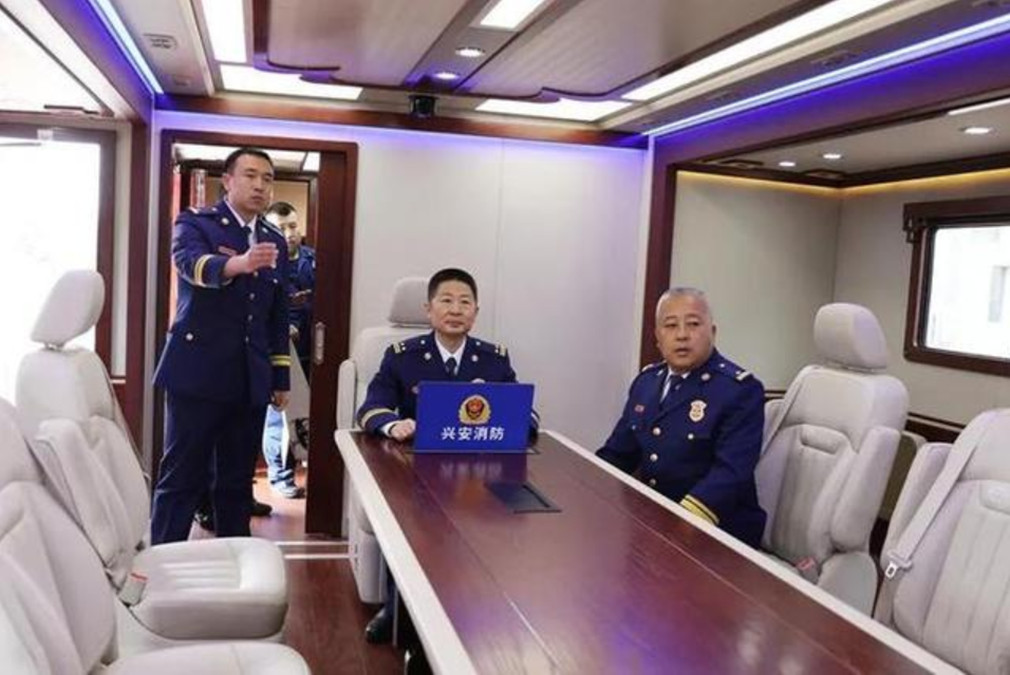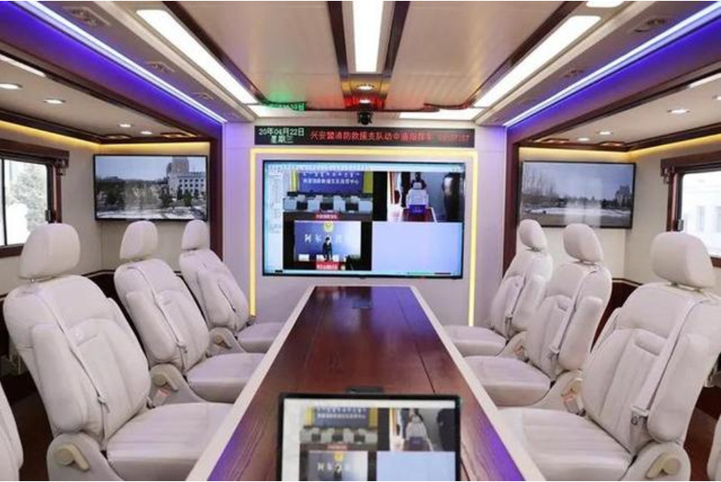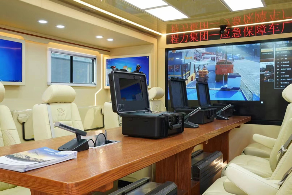 采用重汽汕德卡6×4底盤,車輛長度11200mm;車內配備9人會議桌椅,另配6個壁掛式折疊桌椅,廂體前面發電機倉與會議室隔開,廂體尾部為控制室。廂體按空間區域分為前壁艙,乘、住區,衛生間。廂體采用聚氨酯發泡技術制作的保溫廂體,外蒙皮為1.5mm厚防銹鋁板、內蒙皮為1.5mm防銹鋁板。對于有懸掛裝置要求的廂板,在相應位置增加預埋和支撐。內粘波音軟片,整個底部墊有麻灰色塑膠地板,結實 前壁艙內放置地板蓋板,滅火器等配件;乘、住區在中部擴展位,中間固定床設置在主廂體上,折疊床在左、右廂體上;左、右廂體前部各掛19寸車載液晶電視一臺 衛生間在后部,頂部安裝天窗、換氣裝置;主廂體頂部設有空調,沿頂部送風管道向廂體各處送風。各風口安裝雙眼布風器,可調節風量及角度;主廂體頂部設置衛星接收天線;整車設置3個單開門,800× 1800鋁合金后門1套、小廂575*1750房車門2套,左、右廂體兩側安裝鋁合金推拉窗共6(1000*600)扇,內側安裝窗簾。廂體后部設置可折疊蹬頂梯通向車頂,廂體頂部粘接防滑粘。