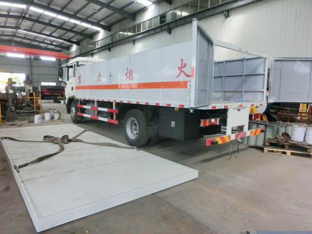 廂體配置:嚴格按照公告尺寸制作。外板采用優質冷軋鋼板帶百葉窗,內飾為導電性能良好的鋁平板有透氣孔,矩形骨架結構內部填充防潮阻燃擠朔板,復合加鉚合工藝。廂體四周鋁合金包邊及包角,車廂底板鋪設防靜電膠皮,廂體前臉鋪設防靜電膠皮。后部設置對開門,可選裝側門位置,廂體內部兩側安裝捆綁貨物的臥環。廂體內部安裝氣體感應器及防盜報警器。車廂一周粘貼橙色放光帶,箱體粘貼 菱形告示牌,安全告示牌(鋁合金材質),危險品牌,箱體安裝示廓燈(前白后紅)。該車適用于運輸危險品,廂體頂部封閉,不可開啟。危險貨物運輸車輛類型為:AT型;用于運輸具有獨立容器(瓶)包裝的毒性氣體:液氯,類項號:6.1;液氨,四氟化硅,類項號:2.3。